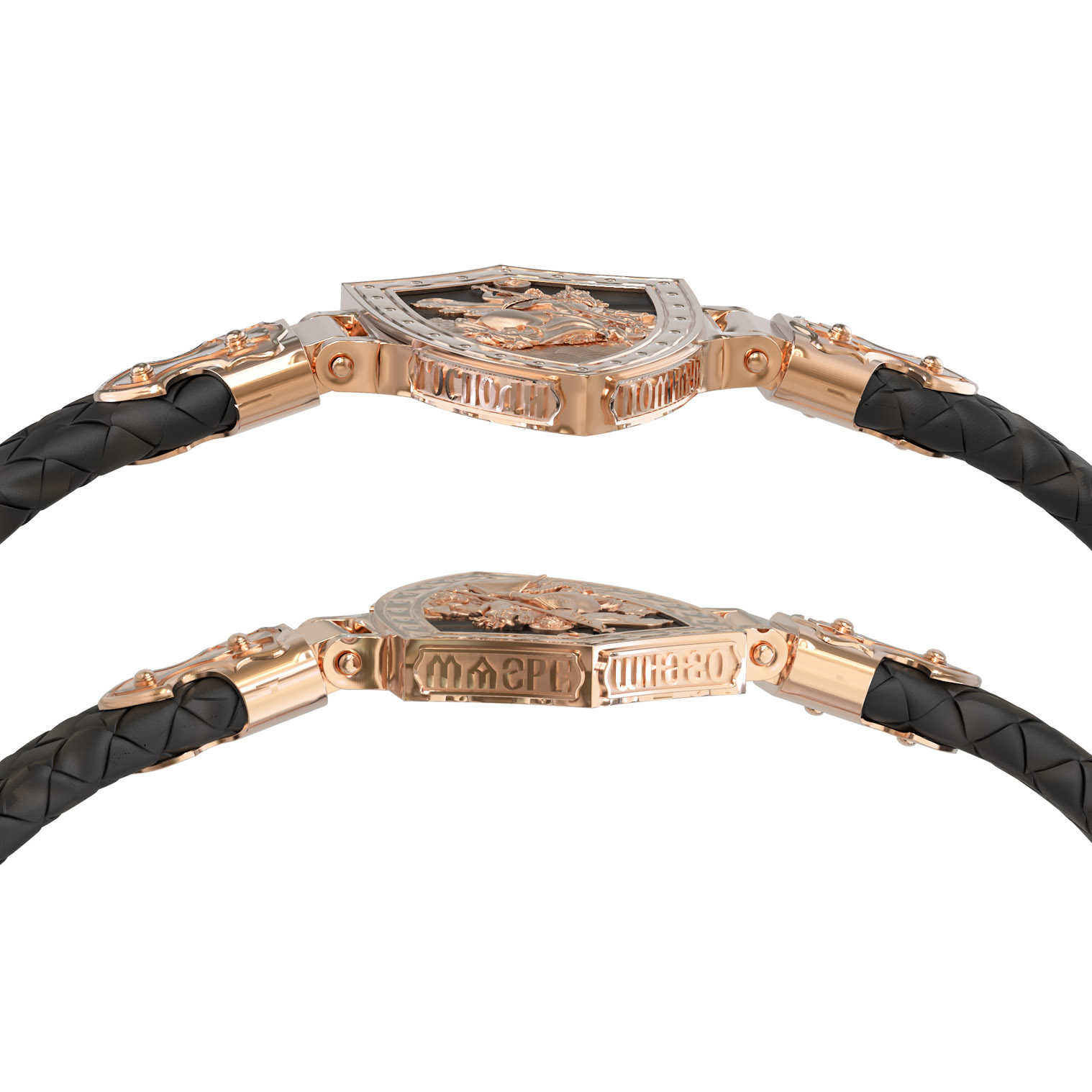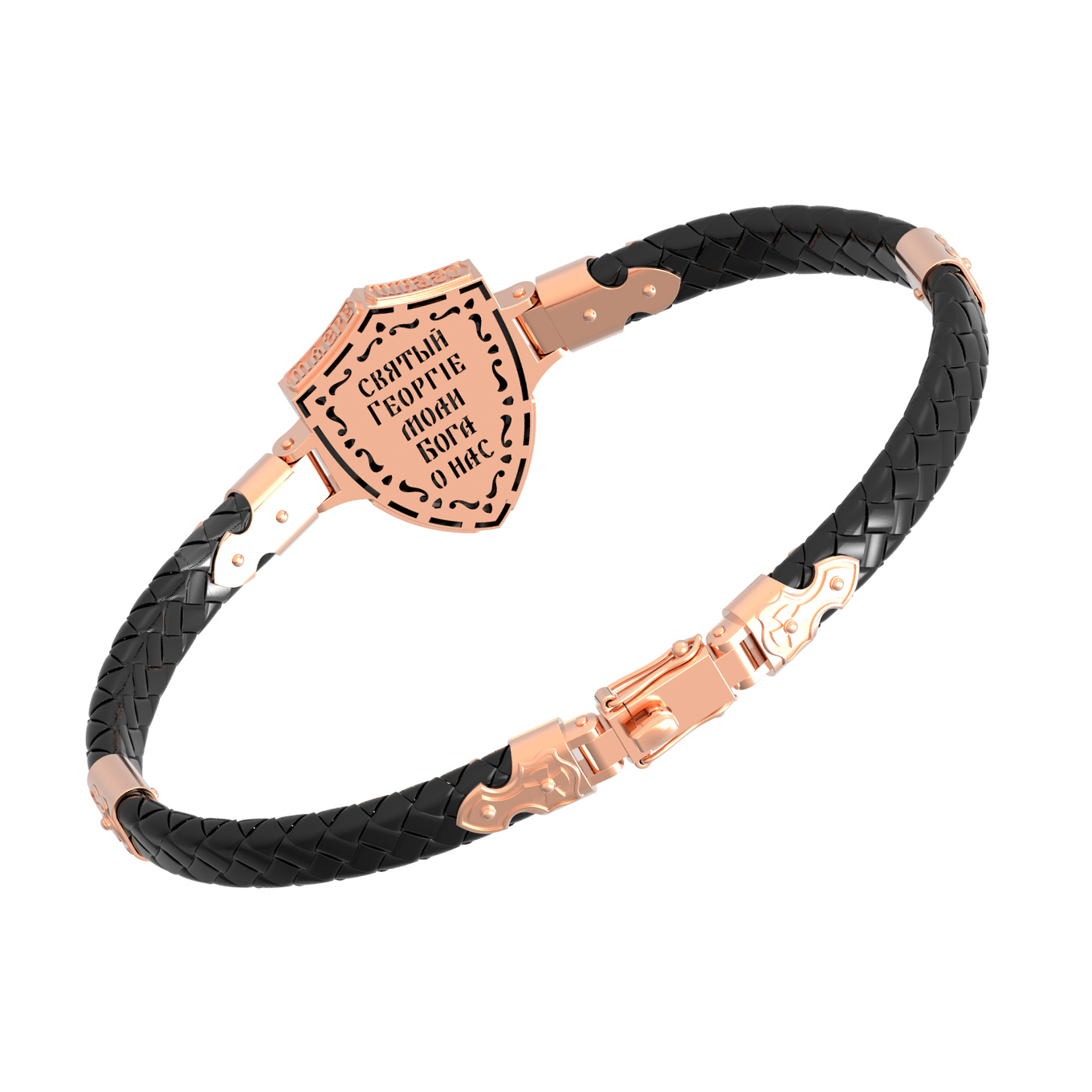 Основой композиции лицевой стороны браслета является изображение Святого Великомученика Георгия Победоносца — одного из самых почитаемых и удивительных святых. Георгий родился в Каппадокии (Малая Азия) в семье богатых и знатных горожан. Юношей поступил на службу к римскому императору Диоклетиану, за отличное знание военного дела и проявленную в боях и походах храбрость был приближен к императору и удостоен высокого воинского звания. Во время начавшихся гонений на христиан, перешел на сторону гонимых и, отвергнув человеческий страх, стал ярым проповедником учения Христа. Мучители подвергли опального воеводу жесточайшим восьмидневным пыткам и казнили его (обезглавили) в возрасте около тридцати лет в 303 году. На Руси он известен как Юрий или Егорий, заступник для верующих, чья жизнь имеет какое-либо отношение к военным делам, помощник в крестьянском труде. Браслет сделан в виде воинского щита. На нем Георгий изображен как воитель, сидящий на вздыбленном коне и поражающий копьем огнедышащего змея. Над образом изображена благословляющая Божия десница. Змей символизирует собою сатанинские силы. Молитвами вознесенными к Всевышнему и своей непреклонной верой он смог одолеть чудовище. Святой убил змея, спас царскую дочь, принесенную в жертву, и жителей города, их души от влияния дьявола, породив в них надежду и веру в Господа, призывая людей принять христианскую веру. На торце изделия помещена молитва: «Господи, помилуй мя грешного».
