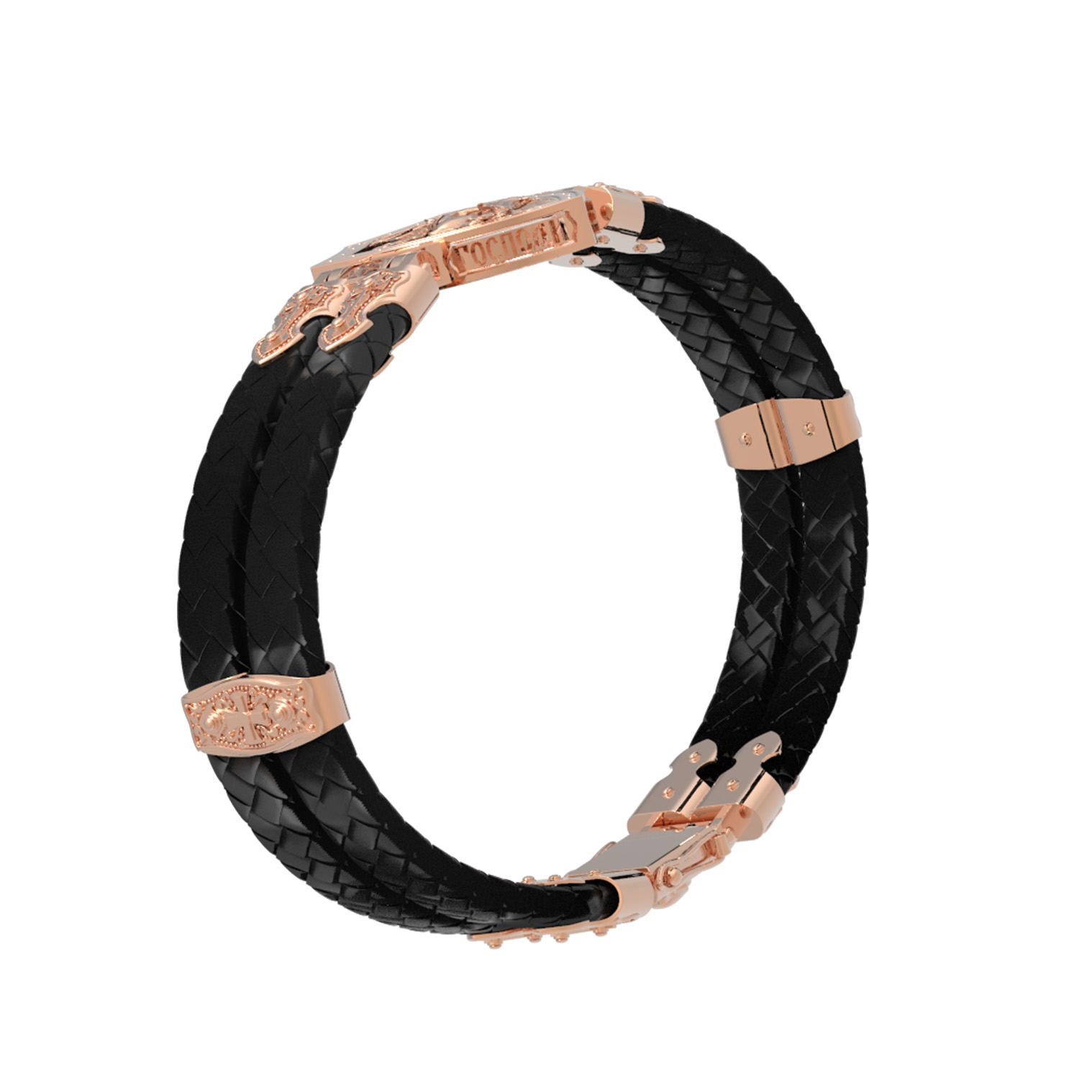 Основой композиции лицевой стороны браслета является изображение Святого Великомученика Георгия Победоносца — одного из самых почитаемых и удивительных святых. Георгий родился в Каппадокии (Малая Азия) в семье богатых и знатных горожан. Юношей поступил на службу к римскому императору Диоклетиану, за отличное знание военного дела и проявленную в боях и походах храбрость был приближен к императору и удостоен высокого воинского звания. Во время начавшихся гонений на христиан, перешел на сторону гонимых и, отвергнув человеческий страх, стал ярым проповедником учения Христа. Мучители подвергли опального воеводу жесточайшим восьмидневным пыткам и казнили его (обезглавили) в возрасте около тридцати лет в 303 году. На Руси он известен как Юрий или Егорий, заступник для верующих, чья жизнь имеет какое-либо отношение к военным делам, помощник в крестьянском труде. Браслет сделан в виде воинского щита. На нем Георгий изображен как воитель, сидящий на вздыбленном коне и поражающий копьем огнедышащего змея. Над образом изображена благословляющая Божия десница. Змей символизирует собою сатанинские силы. Молитвами вознесенными к Всевышнему и своей непреклонной верой он смог одолеть чудовище. Святой убил змея, спас царскую дочь, принесенную в жертву, и жителей города, их души от влияния дьявола, породив в них надежду и веру в Господа, призывая людей принять христианскую веру. На торце изделия помещена молитва: «Господи, помилуй мя грешного».