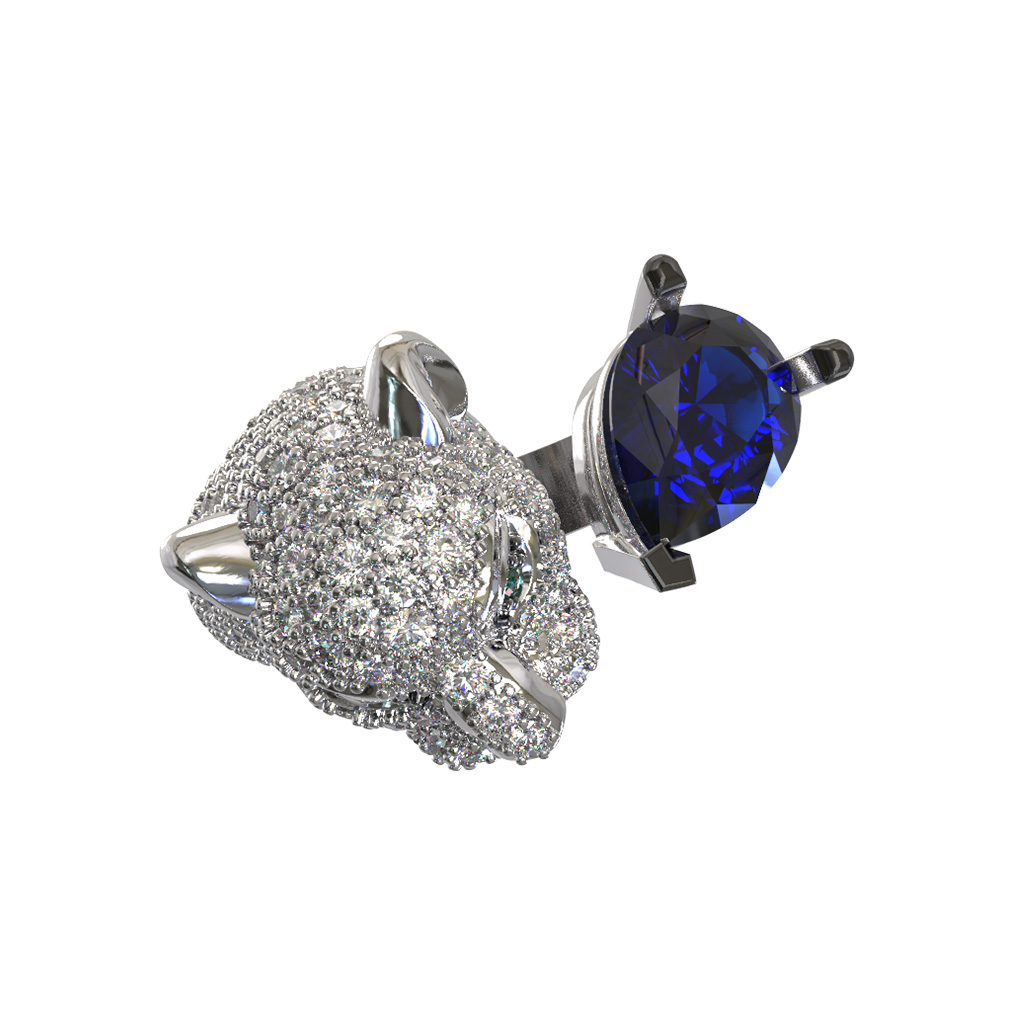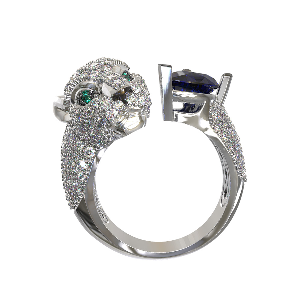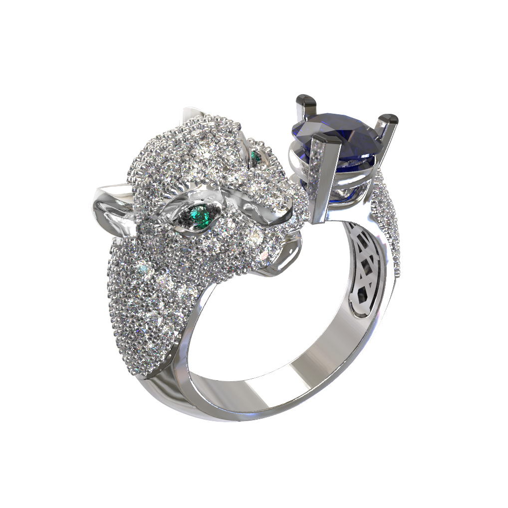Кольцо из белого золота c бриллиантами, сапфиром и изумрудом