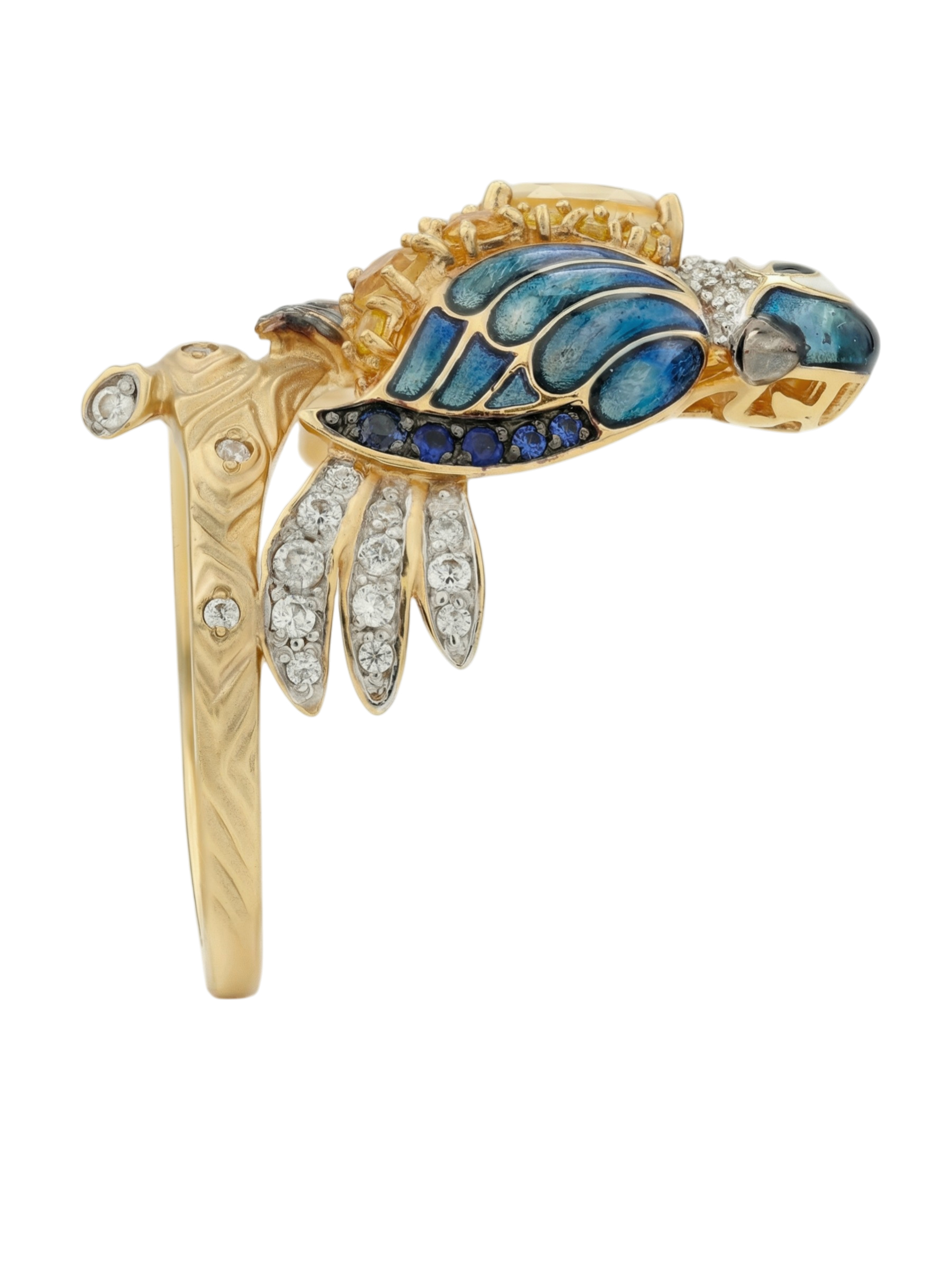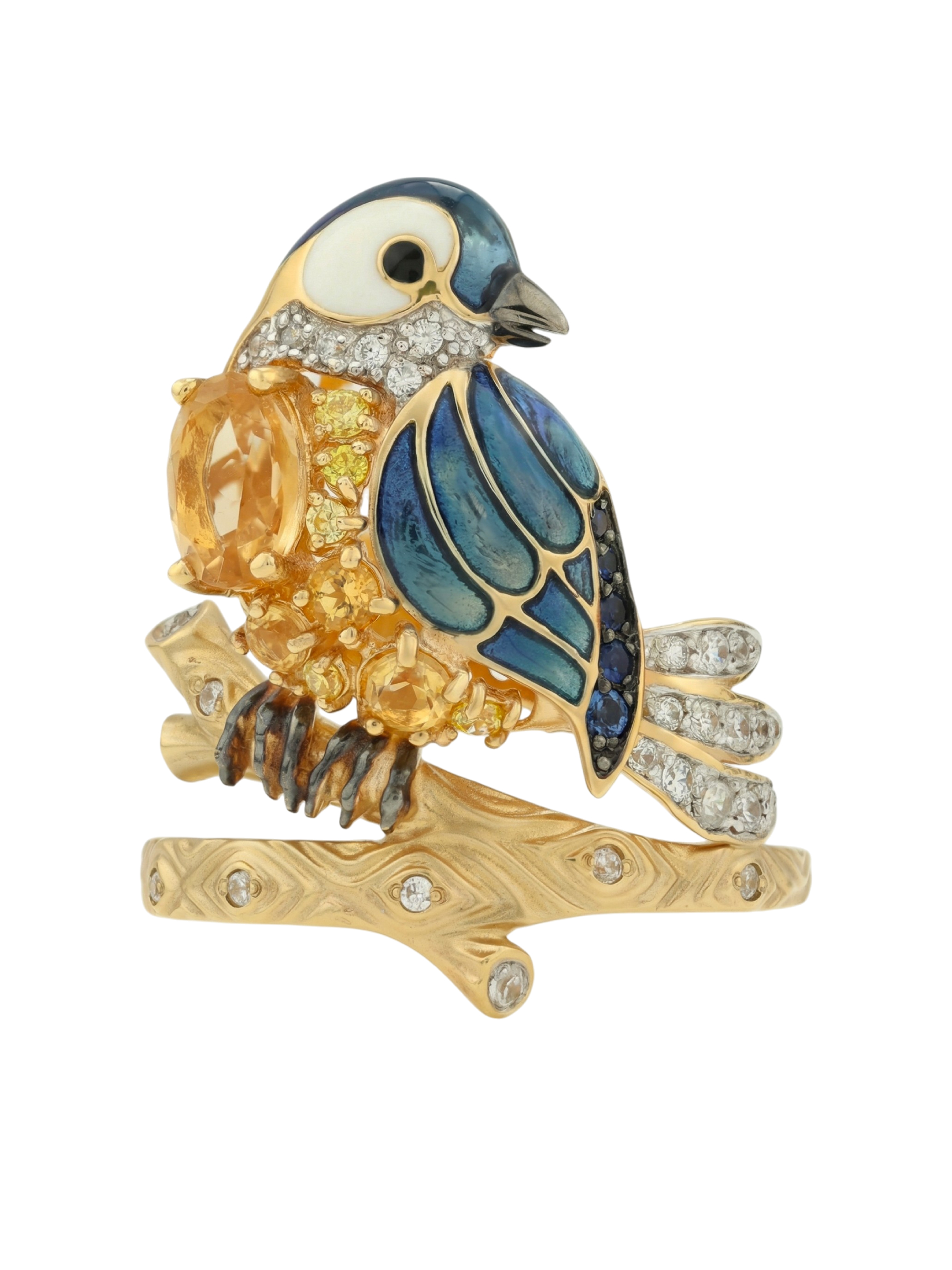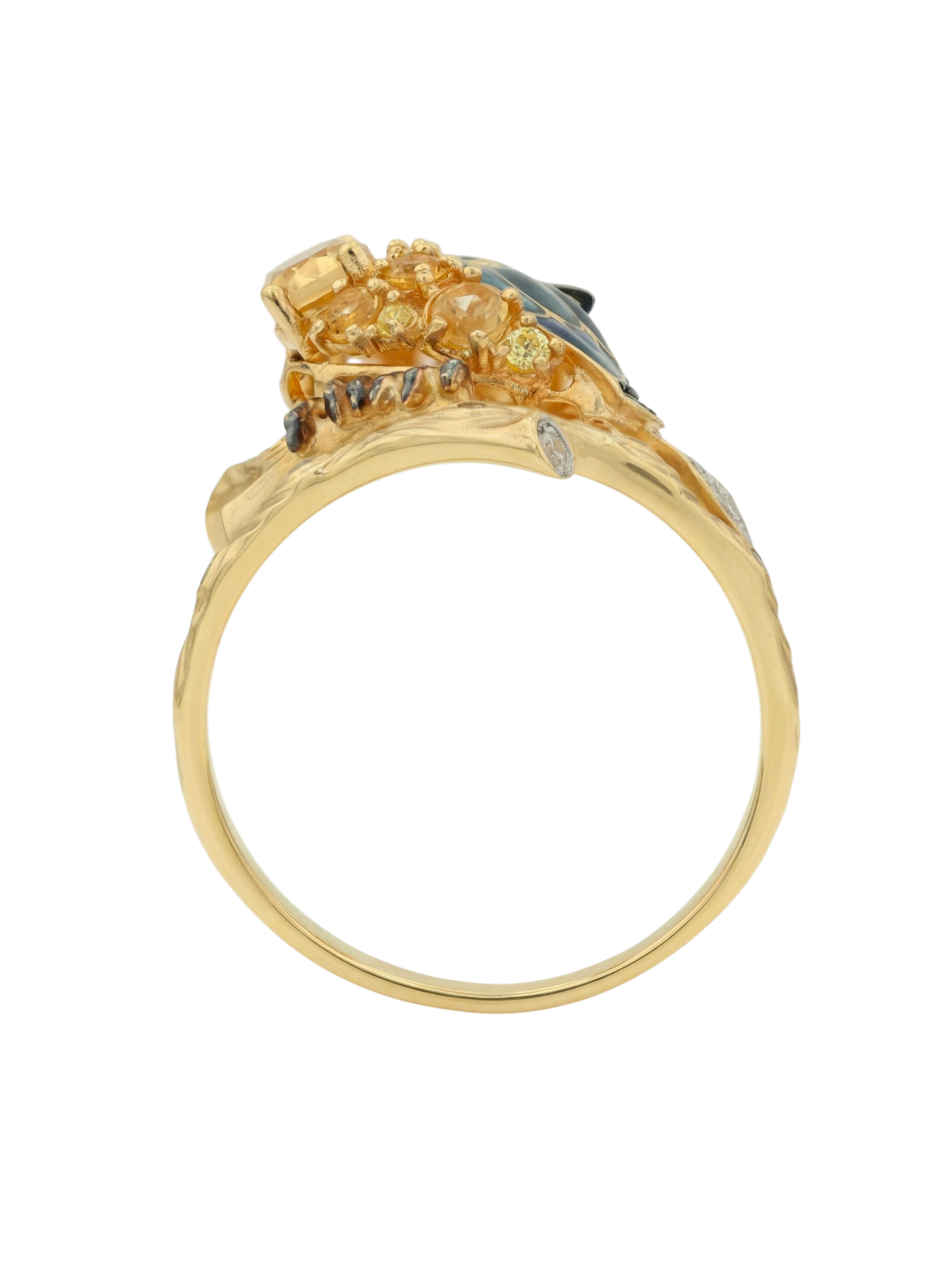 Кольцо из лимонного золота c эмаль, фианитом, цитрином и сапфиром