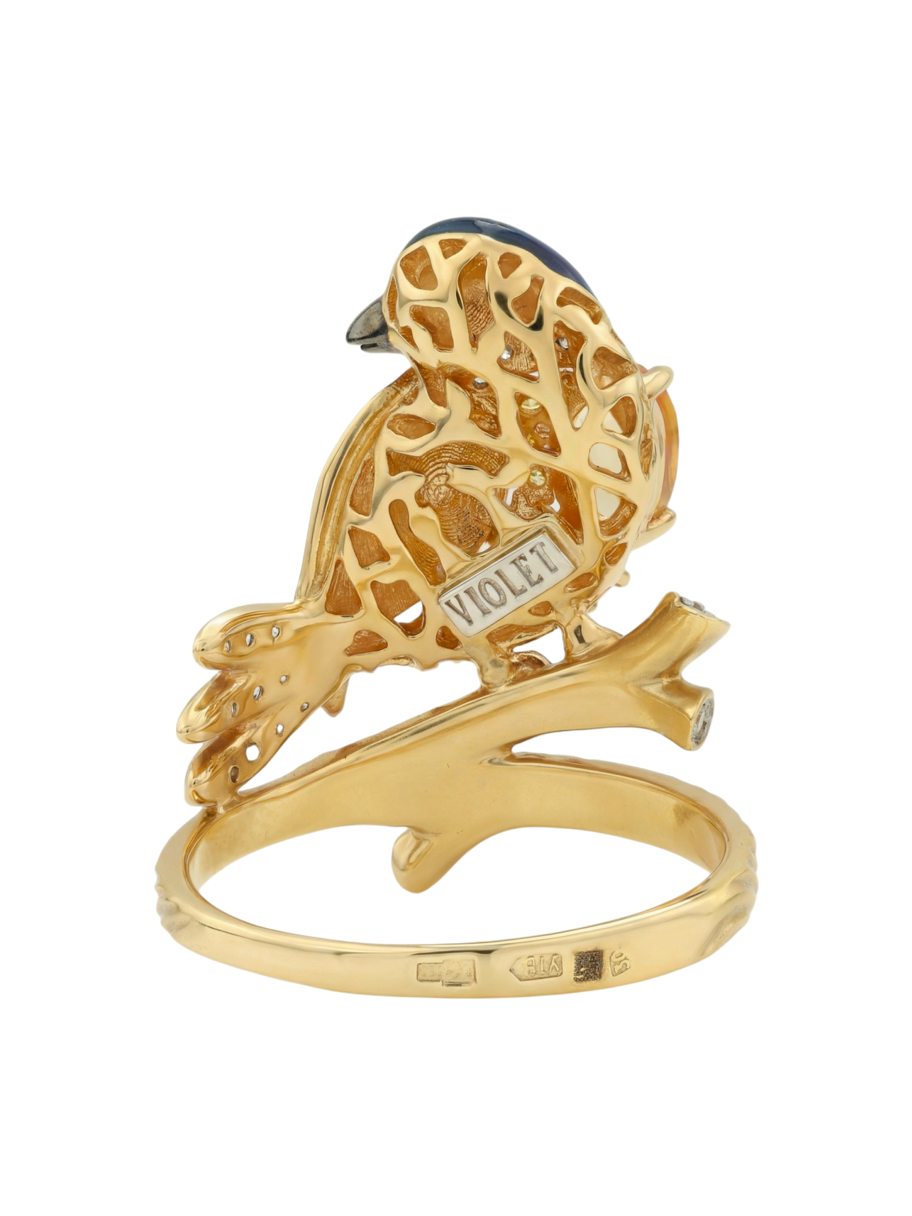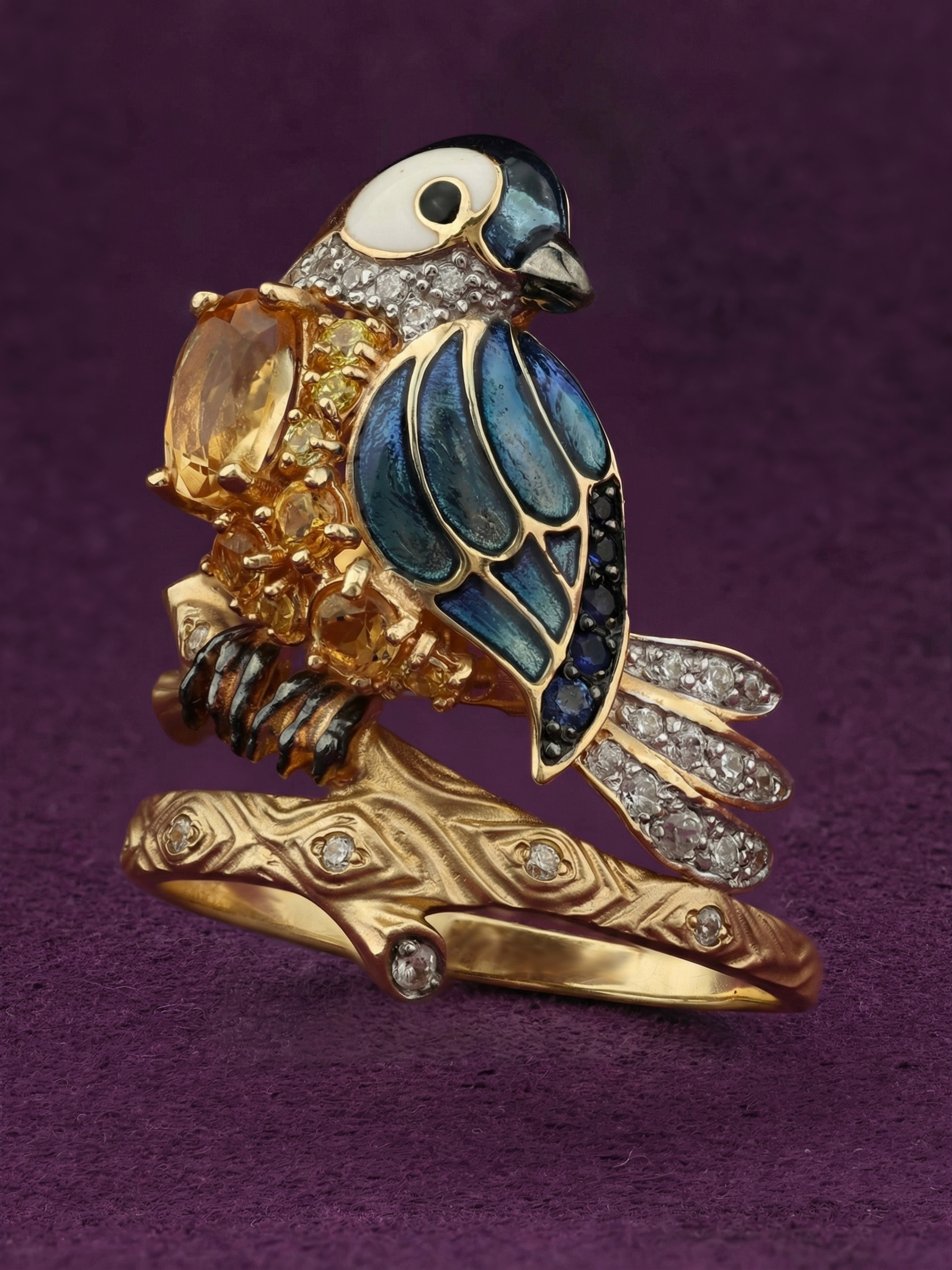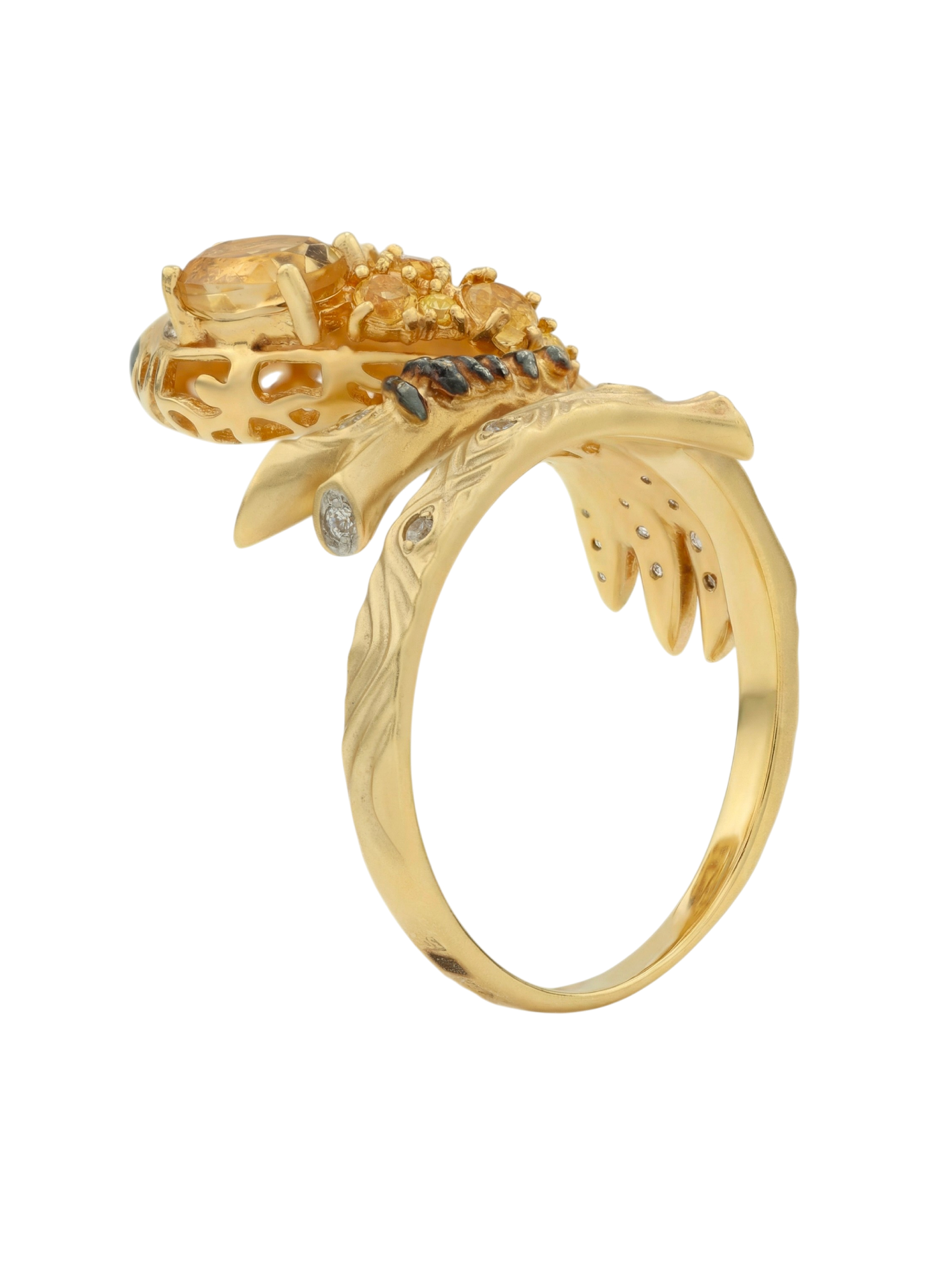 Кольцо из лимонного золота c эмаль, фианитом, цитрином и сапфиром