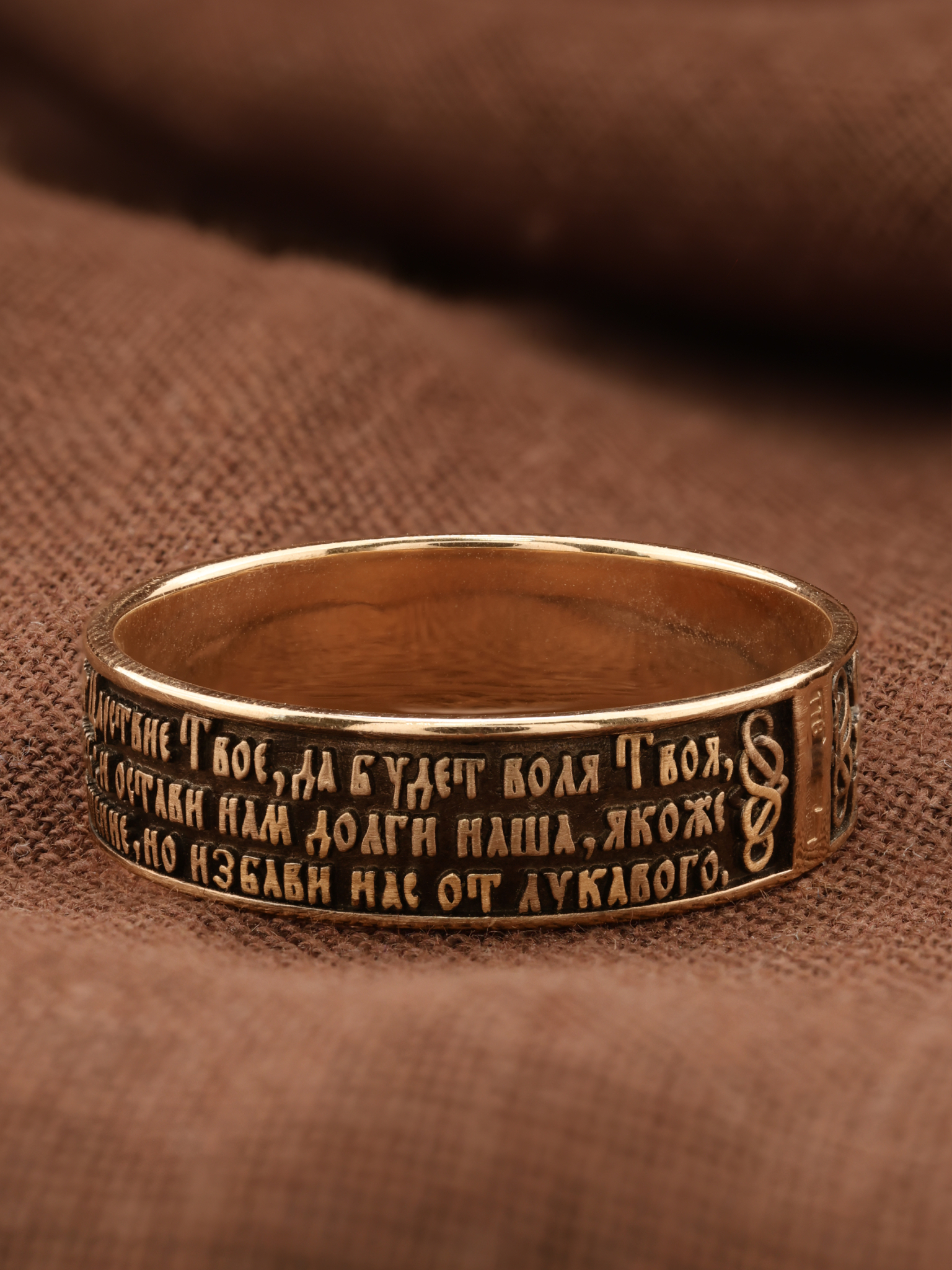 На лицевой стороне кольца отображена Божественная молитва к Богу Отцу, которую, Господь Иисус Христос дал своим ученикам. Молитва Господня приводится в Евангелиях в двух вариантах, более пространном в Евангелии от Матфея и кратком — в Евангелии от Луки. Различны и обстоятельства при которых Христос произносит текст молитвы. В Евангелии от Матфея «Отче наш» входит в состав Нагорной проповеди. Евангелист Лука пишет, что апостолы обратились к Спасителю: «Господи! Научи нас молиться, как и Иоанн научил учеников своих » (Лк. 11, 1). «Отче наш, Иже еси на небесе? х! Да святится имя Твое, да прии? дет Царствие Твое, да будет воля Твоя, яко на небеси? и на земли?. Хлеб наш насущный да? ждь нам дне? сь; и оста? ви нам до? лги наша, якоже и мы оставляем должнико? м нашим; и не введи нас во искушение, но изба? ви нас от лукаваго.»