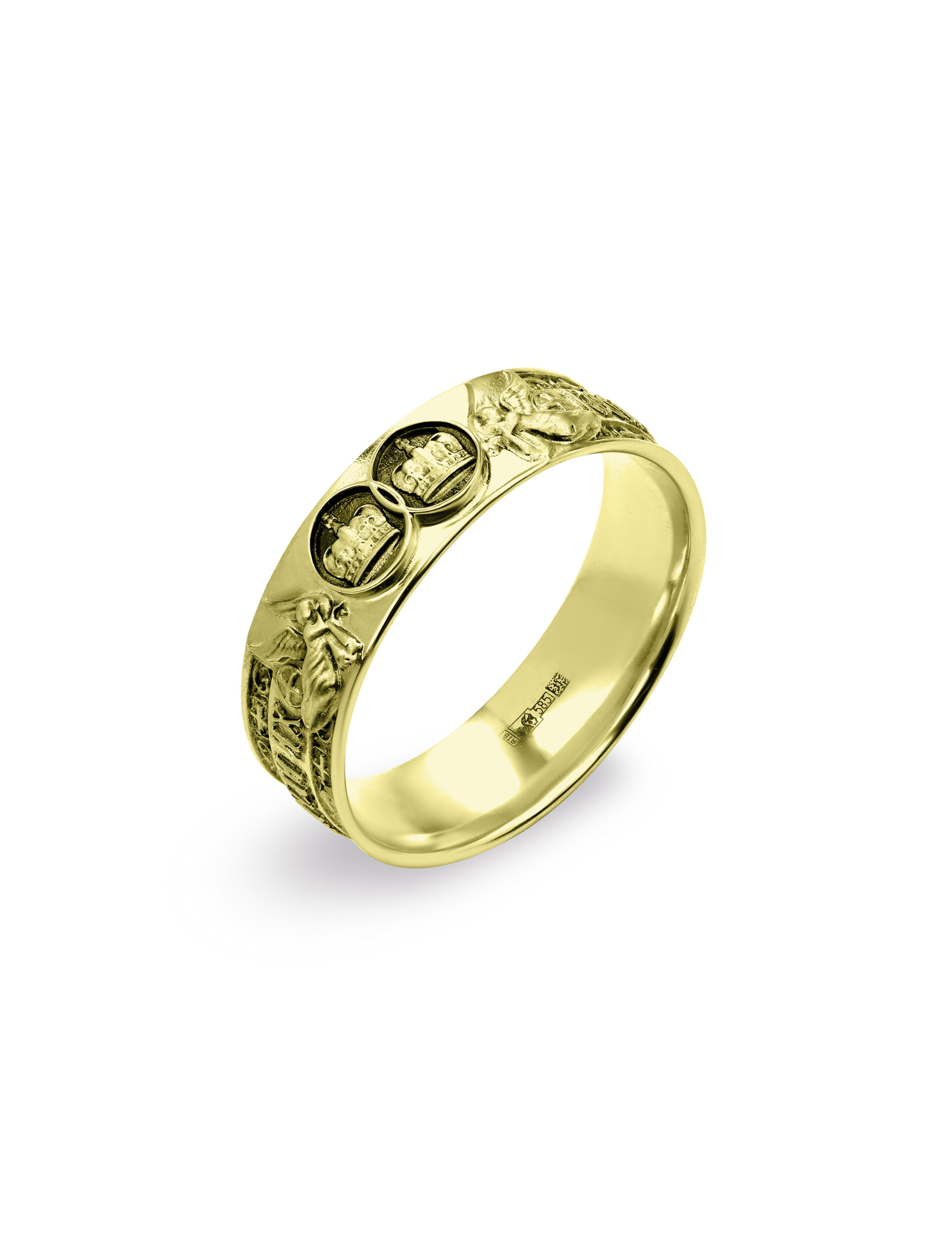 На лицевой стороне между Херувимов в кругах, символизирующих обручальные кольца, изображены венчальные венцы, и по кольцу написана молитва «Господи Боже Наш славою и честью венчай их»