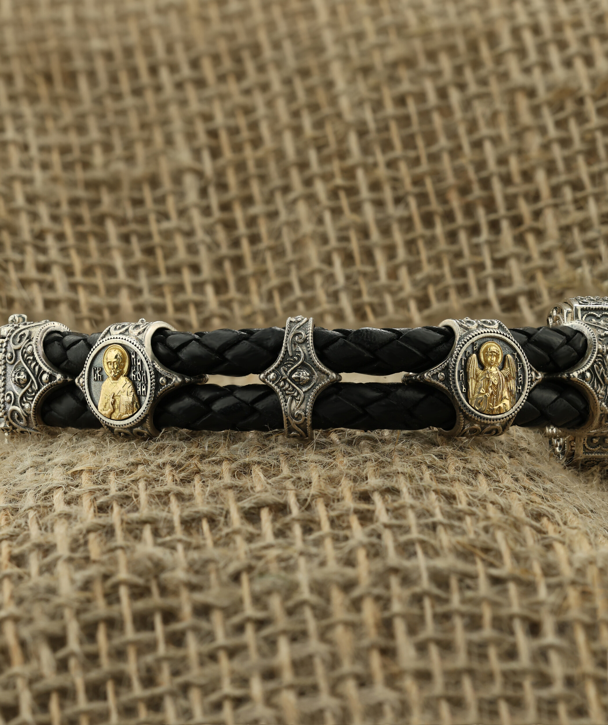 Браслет из серебра и золота c кожаным шнурком и ониксом