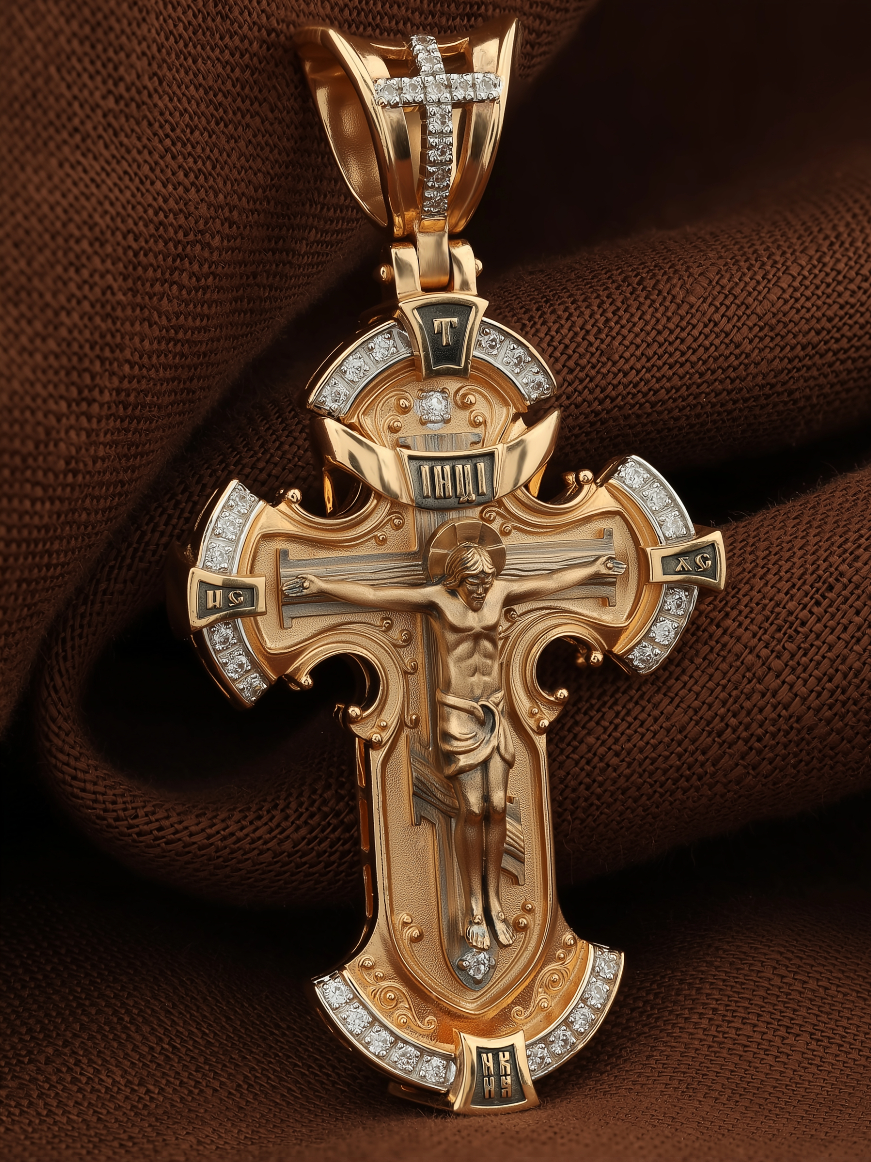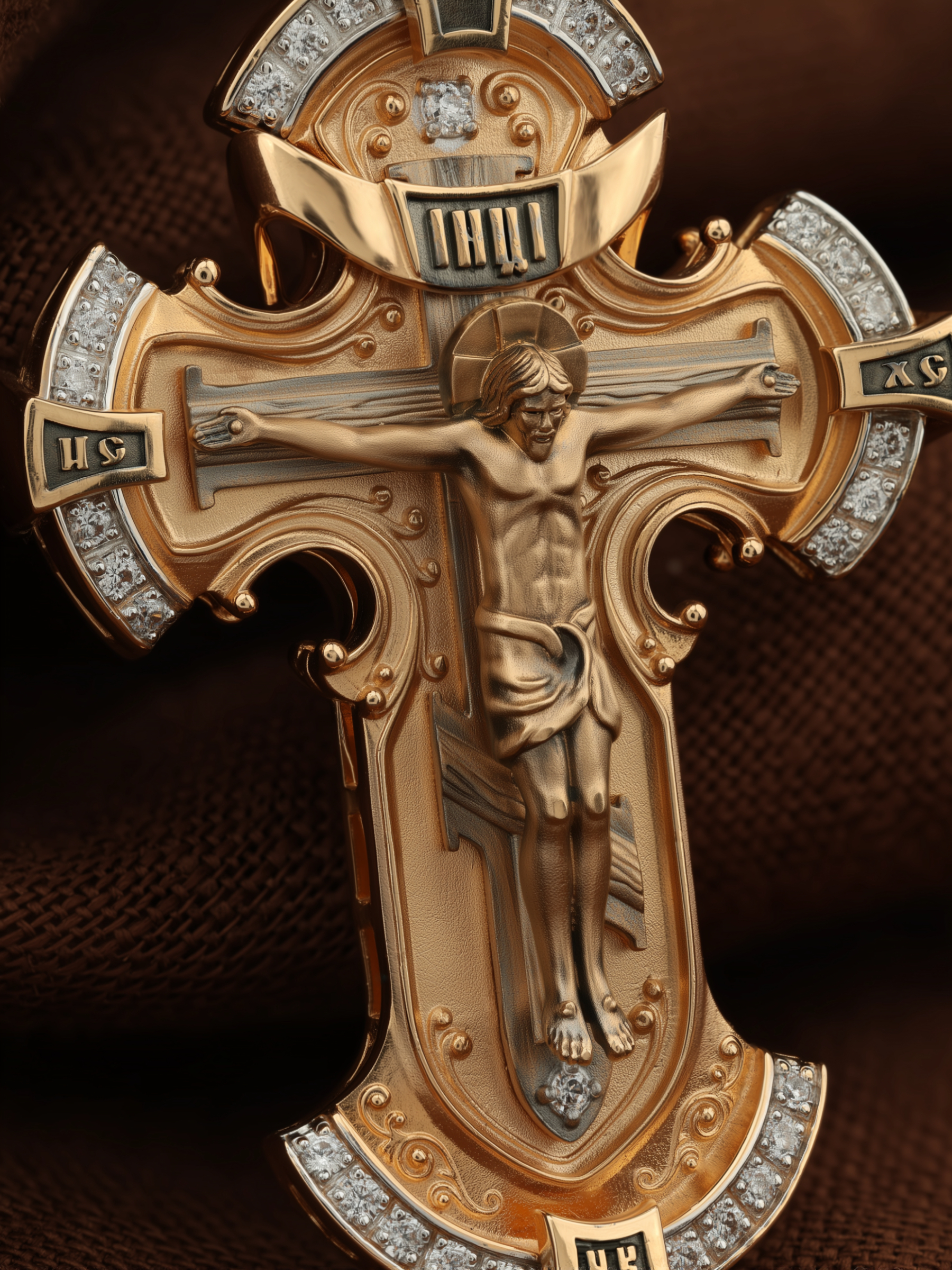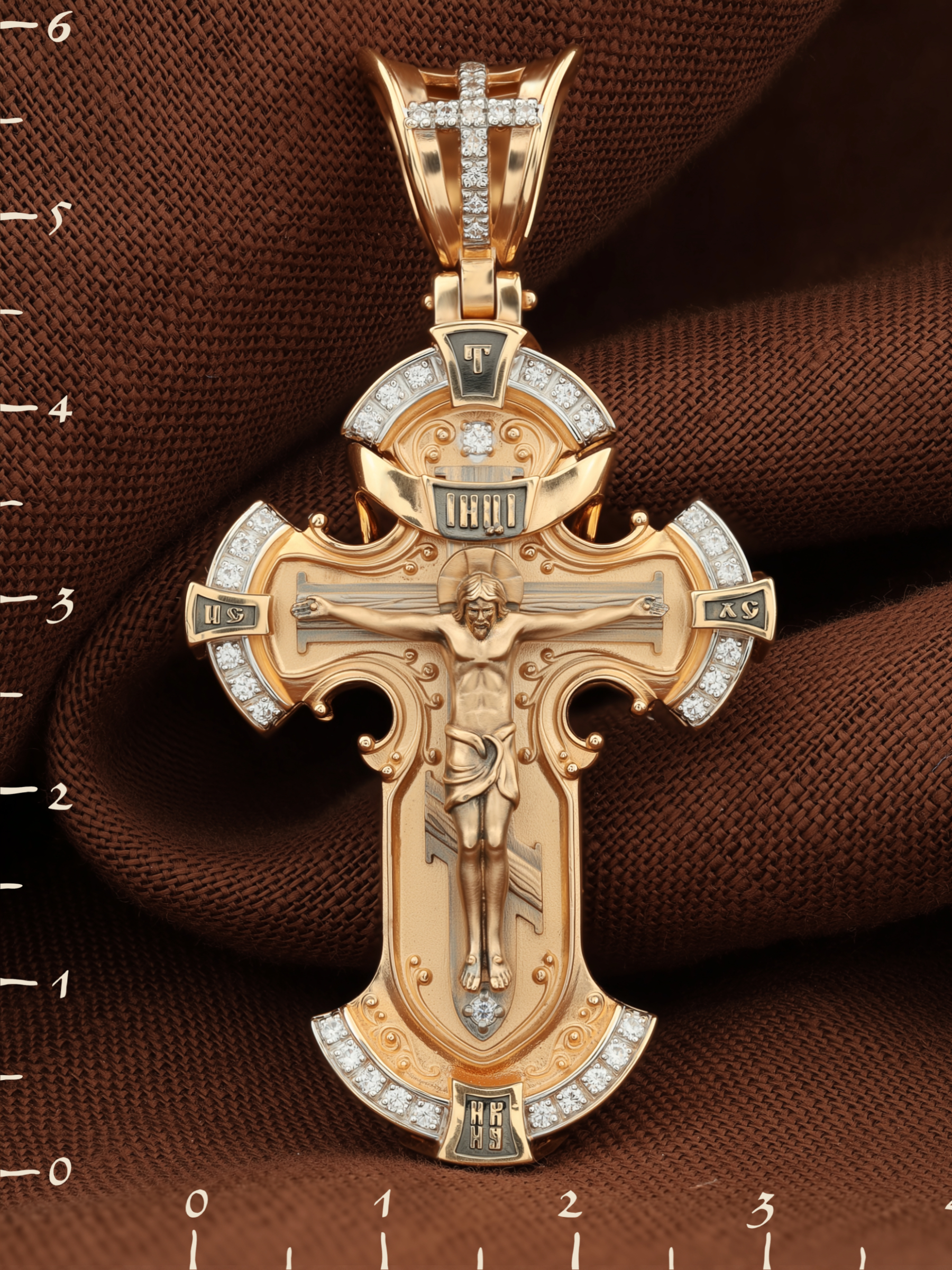 На лицевой стороне креста изображено Распятие Иисуса Христа на Голгофском Кресте, верхняя перекладина которого символизирует титло — табличку, на которой, согласно Евангелию, было начертано: Иисус Назорей Царь Иудейский (IНЦI). Справа и слева от Распятия изображены символы «IС ХС» — святое имя Христа. Внизу креста написано слово «НИКА», что значит «победитель». В верхней части креста обозначена буква «Т», которая символизирует одно из орудий страданий Господа — трость.