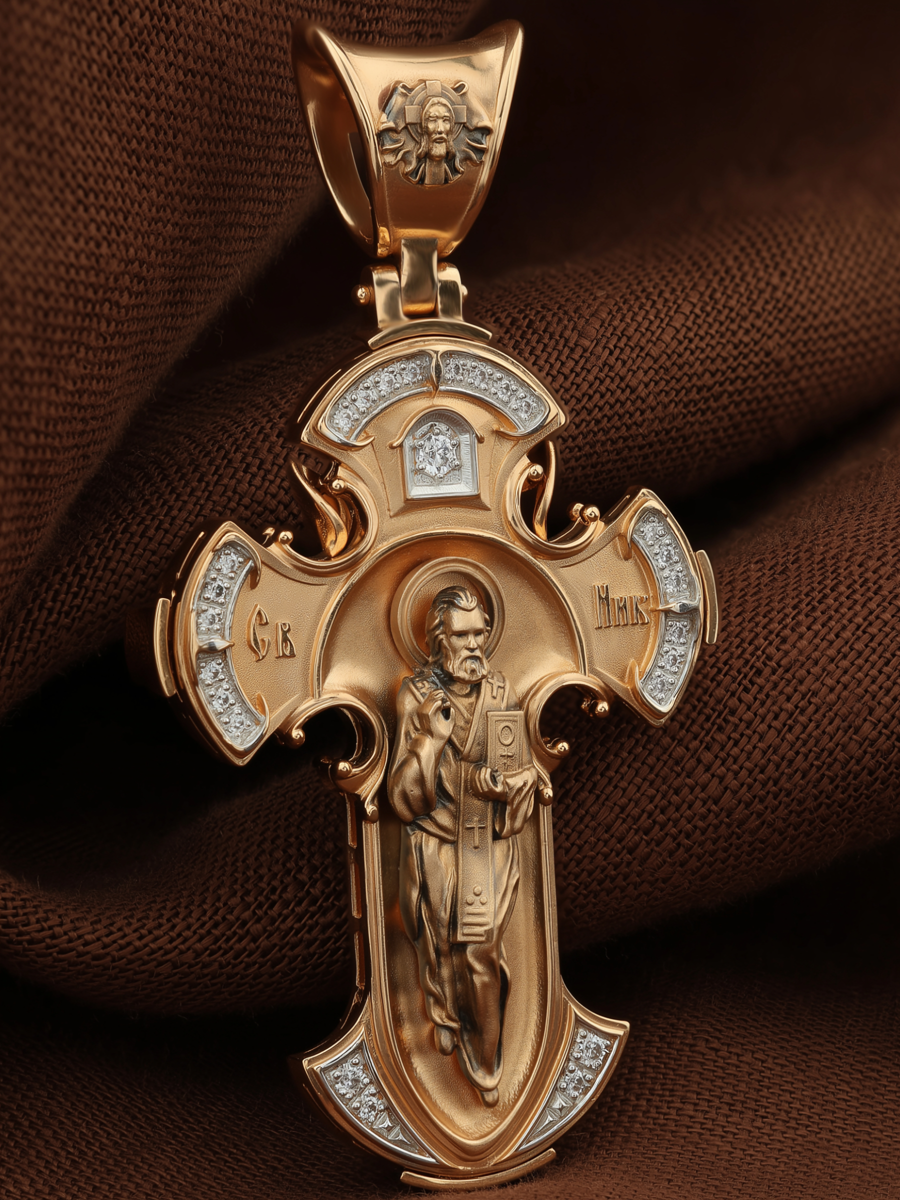 Оборотную сторону креста возглавляет икона святителя Николая Чудотворца. На кулонном кольце помещено изображение Спаса Нерукотворного — образ Спасителя, который Он запечатлел на плате и передал для исцеления больному проказой царю Эдессы. ему придается победное и защитное значение.