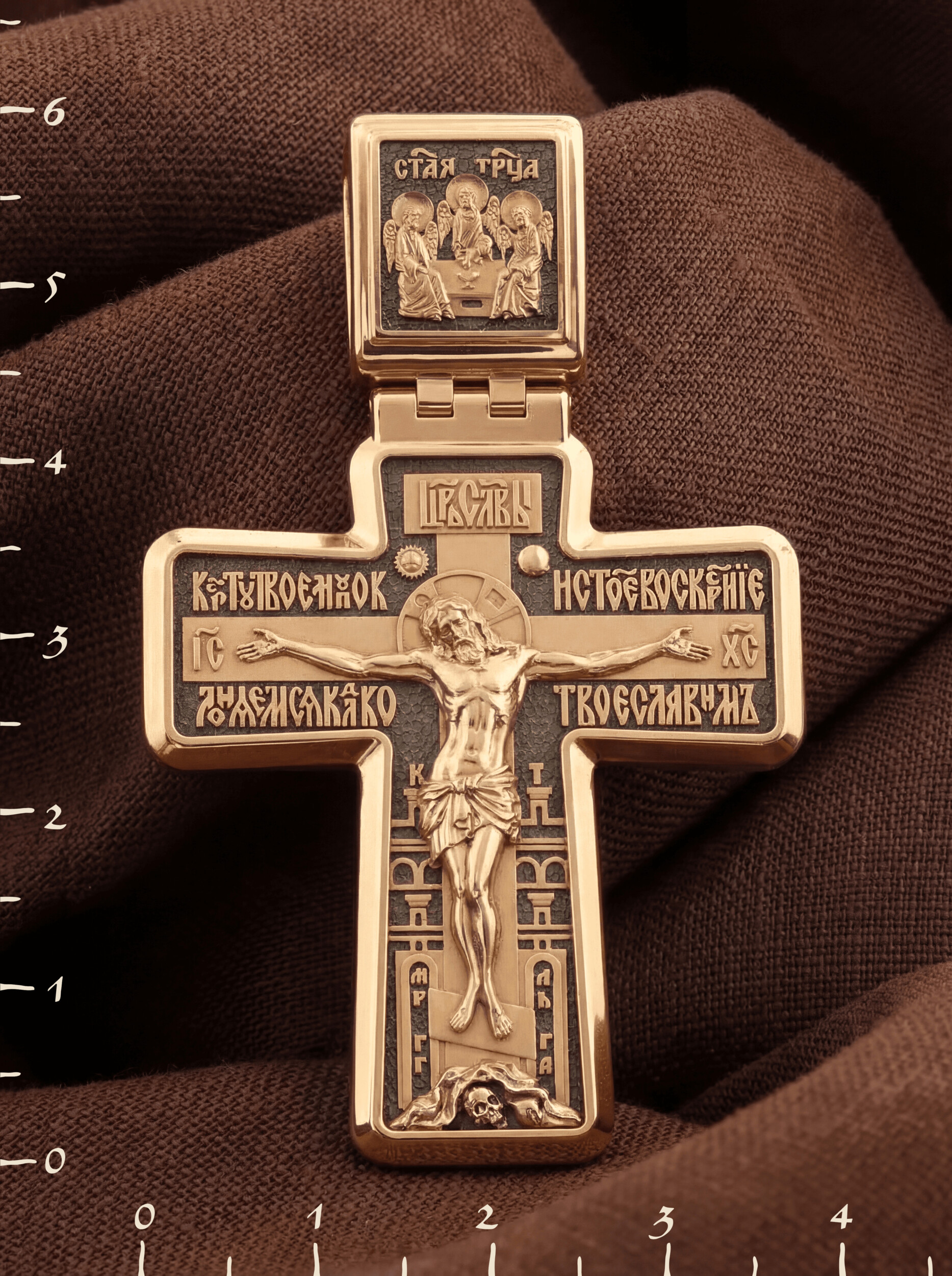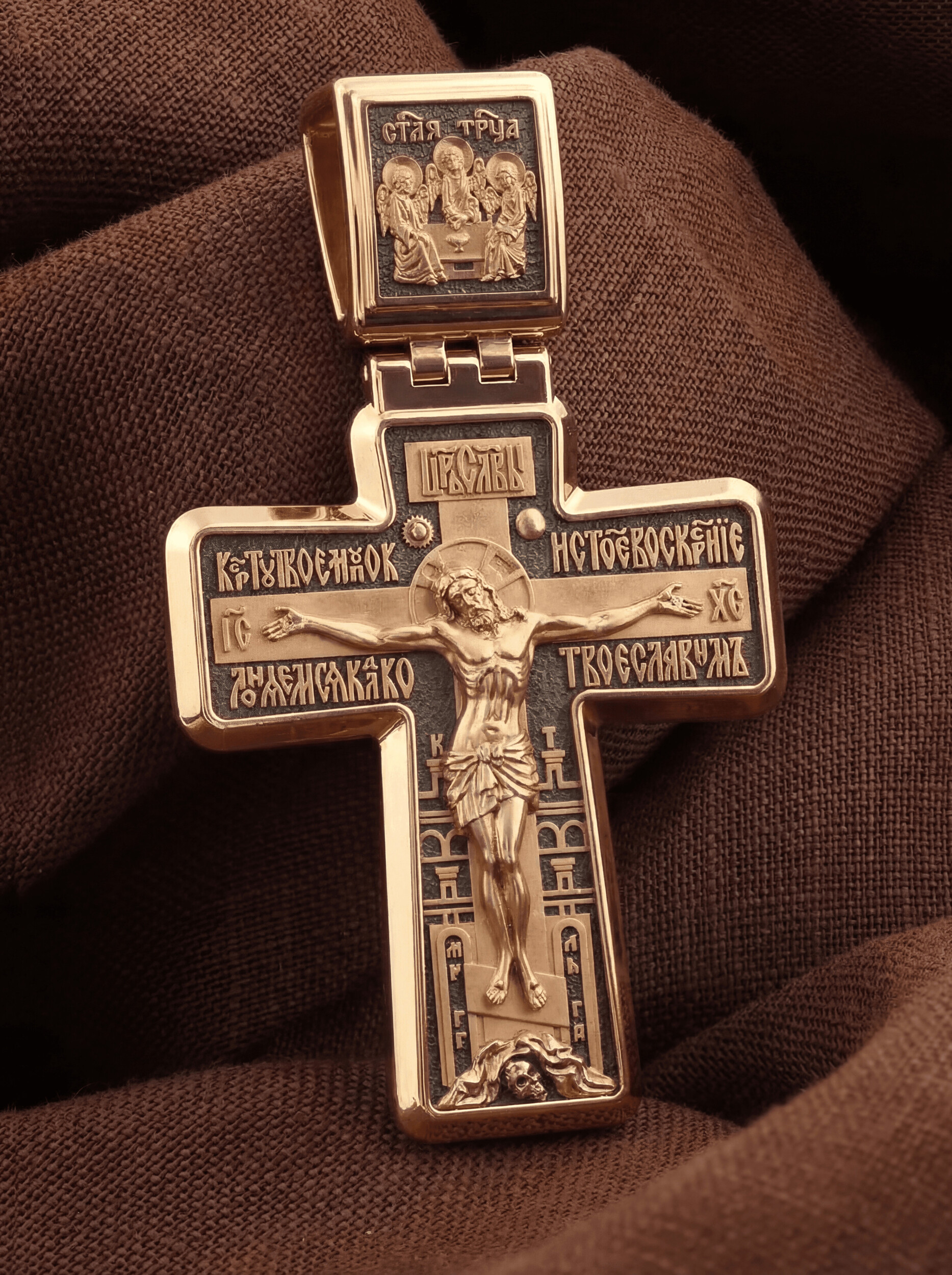 На лицевой стороне креста изображено Распятие Иисуса Христа. Позади Его изображена иерусалимская стена, знак того, что Господь был распят вне стен города. Но вместе с тем стена знаменует и Небесный Иерусалим, путь в который открылся для человечества через Голгофу: «МЛРБ», «Место Лобное Рай Бысть» — написано у ее основания. Рядом с Его образом помещены слова «Царь Славы». Эти слова характеризуют Господа, как Великого Архиерея, победителя смерти. Верхняя перекладина символизирует титло — табличку, на которой, согласно Евангелию, было начертано: «Иисус Назорей Царь Иудейский» (IНЦI). Также Распятие сопровождается надписями, олицетворяющими Христа. Это святое имя Христа «IC» (Иисус) «ХС» (Христос), а так же написан тропарь Животворящему Кресту: «Кресту Твоему поклоняемся, Владыко, и святое воскресение Твое славим». Распятие стоит на горе камней, символизирующих Голгофу, в основании которой различается череп. Это голова Адама. На кулонном кольце помещено изображение Святой Троицы.