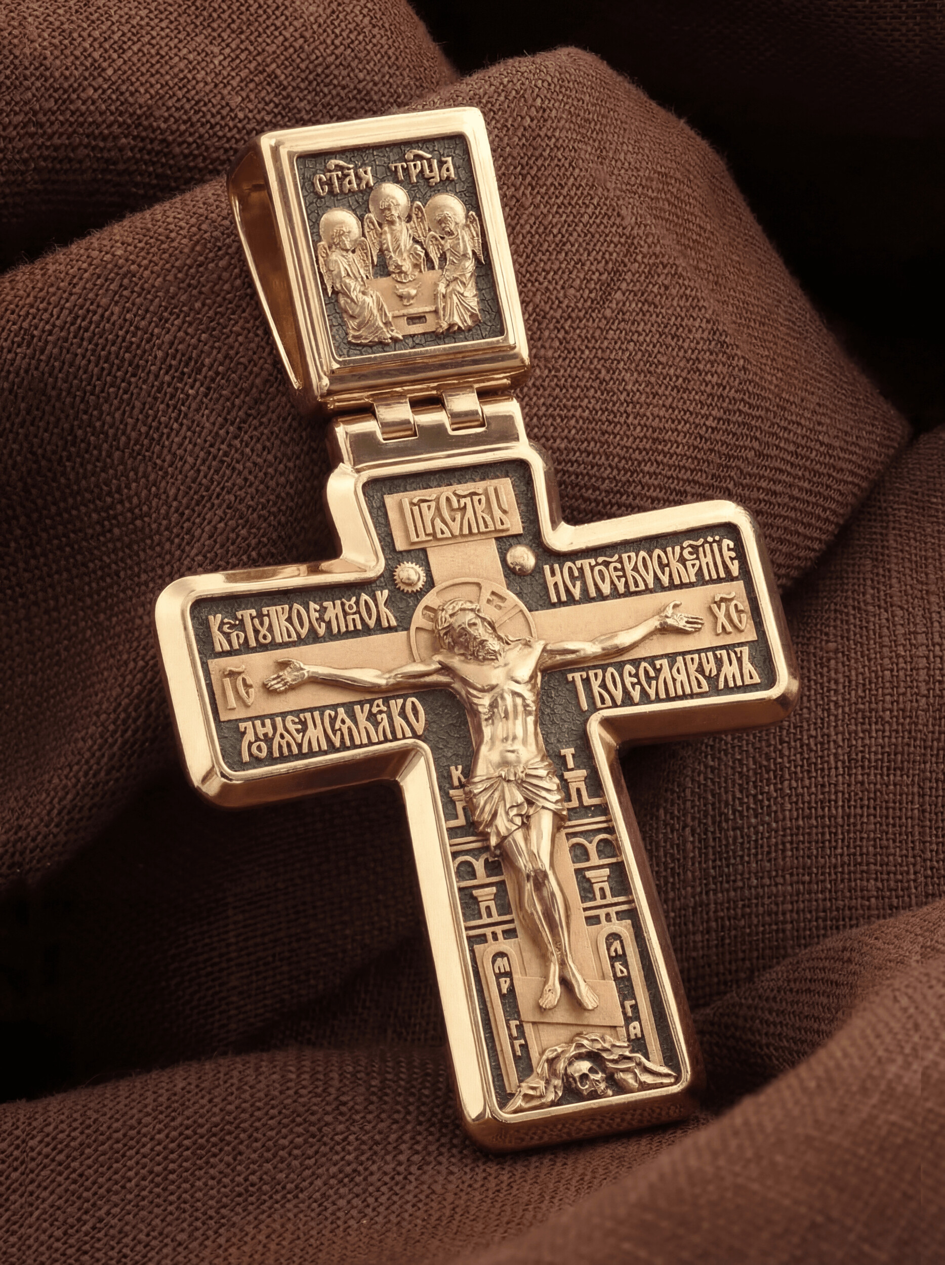 На лицевой стороне креста изображено Распятие Иисуса Христа. Позади Его изображена иерусалимская стена, знак того, что Господь был распят вне стен города. Но вместе с тем стена знаменует и Небесный Иерусалим, путь в который открылся для человечества через Голгофу: «МЛРБ», «Место Лобное Рай Бысть» — написано у ее основания. Рядом с Его образом помещены слова «Царь Славы». Эти слова характеризуют Господа как Великого Архиерея, победителя смерти. Верхняя перекладина символизирует титло — табличку, на которой, согласно Евангелию, было начертано: «Иисус Назорей Царь Иудейский» (IНЦI). Также Распятие сопровождается надписями, олицетворяющими Христа. Это святое имя Христа «IC» (Иисус) «ХС» (Христос), и словосочетание «Сын Божий», а так же написан тропарь Животворящему Кресту: «Кресту Твоему поклоняемся, Владыко, и святое воскресение Твое славим». Распятие стоит на горе камней, символизирующих Голгофу, в основании которой различается череп. Это голова Адама. На кулонном кольце помещено изображение Святой Троицы.