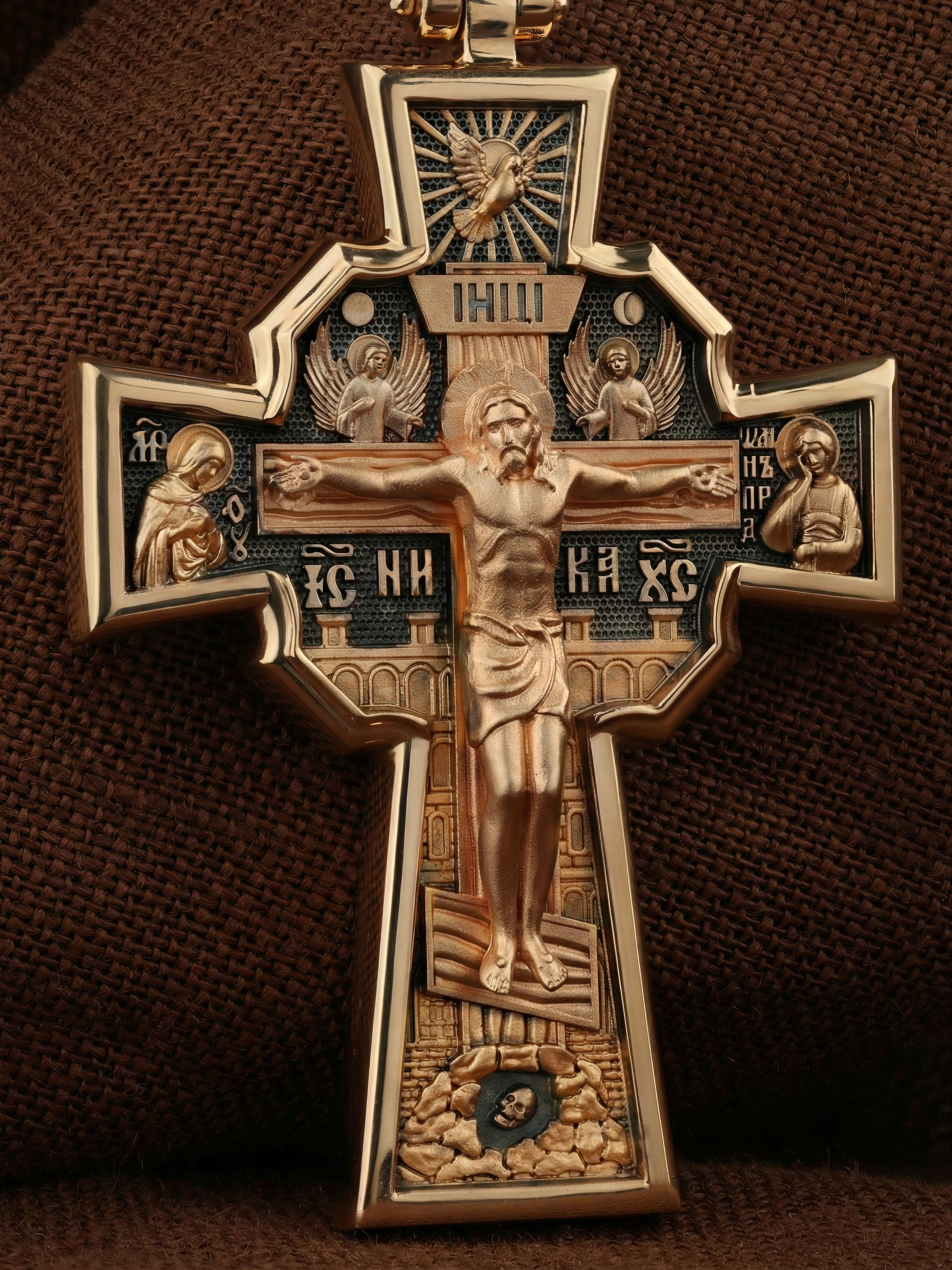На лицевой стороне креста изображено Распятие Господа и Спасителя нашего Иисуса Христа, отдавшего Себя на смерть, для искупления грехов мира. Верхняя перекладина символизирует титло — табличку, на которой, согласно Евангелию, было начертано: Иисус Назорей Царь Иудейский (IНЦI). Распятие сопровождается надписями, олицетворяющими Христа. Надпись «IС» « ХС», что означает Иисус Христос, и слово «НИКА», что означает «победитель», помещаются ниже поперечной перекладины креста. Над вершиной Распятия помещено изображение Святого Духа, в виде голубя сходящего с небес, и двух Ангелов. Слева от Распятия изображена Пресвятая Богородица, справа — апостол и евангелист Иоанн Богослов, один из ближайших учеников Иисуса Христа. За крестом высится Иерусалимская стена, в знак того, что Господь был распят вне стен города. Возвышение, на котором стоит Крест, символизирует гору Голгофу, на которой произошло Распятие. Под подножием Креста изображена покоящаяся голова (череп) Адама. На кулонном кольце помещено изображение шестикрылого Серафим.