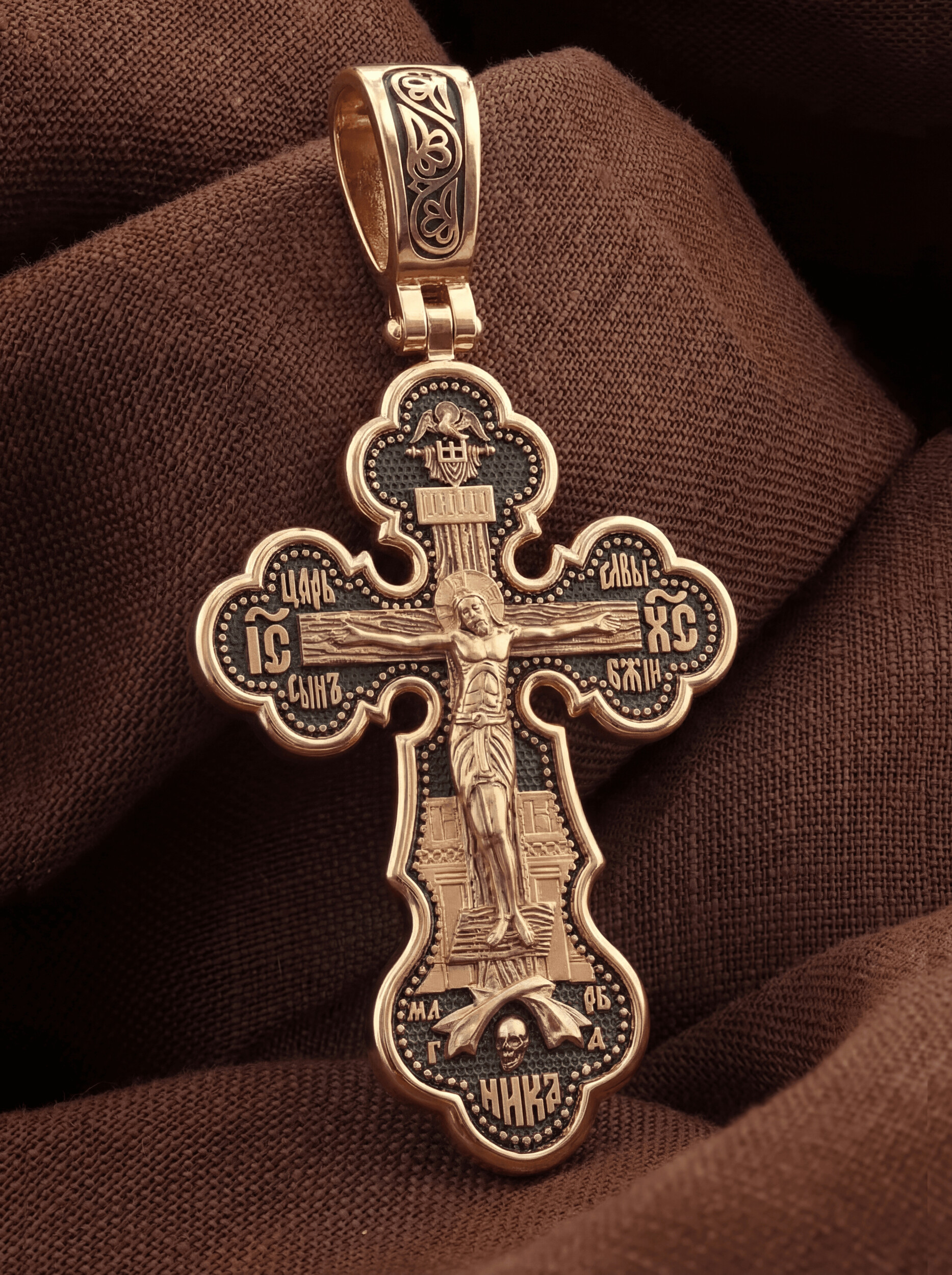 На лицевой стороне креста изображено Распятие Господа и Спасителя нашего Иисуса Христа. Христос, подвергнутый на кресте мучительной казни, своими страданиями искупил нас от древнего греха и даровал нам жизнь вечную. На верхней табличке, выше головы Иисуса, расположена надпись, составленная Понтием Пилатом — «IНЦI». Она означает «Иисус Назорей, Царь Иудейский». Распятие сопровождается каноническими надписями. Надпись «IС ХС» означает Иисус Христос, надпись «Царь Славы» и словосочетание «СЫН БОЖИЙ», что означает божественную природу Иисуса Христа, помещаются на разных сторонах поперечной перекладины креста. В нижней части креста находятся надписи –«НИКА» и «МЛРБ». В переводе с греческого, слово «НИКА» означает «победитель». Именно оно является символом победы Христа над смертью. Надпись «МЛРБ» — «место лобное рай бысть» означает, что место лобное стало раем. Крест стоит на горе камней, символизирующих Голгофу. Под подножием Креста изображена покоящаяся голова (череп) Адама и надпись «Г.А.». Христос в Своей Божественной любви, над которой смерть не властна и которая, страдая, и не страдает в обычном смысле, простирает к людям со Креста Свои объятия, в которые призывается и привлекается весь мир. Поэтому Тело Его не висит, а торжественно покоится на Кресте.
