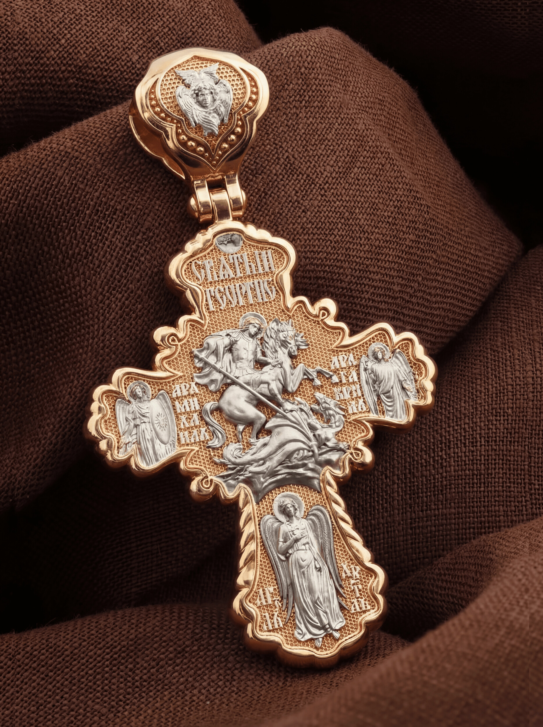 В центре оборотной стороны креста помещено изображение Святого Великомученика Георгия Победоносца. Он изображен как воитель, сидящий на вздыбленном коне и поражающий копьем огнедышащего змея. Змей символизирует собою сатанинские силы. Молитвами вознесенными к Всевышнему и своей непреклонной верой он смог одолеть чудовище. Святой убил змея, спас царскую дочь, принесенную в жертву, и жителей города, их души от влияния дьявола, породив в них надежду и веру в Господа, призывая людей принять христианскую веру. Слева от Святого Георгия изображен Архистратиг Михаил, справа — Архангел Гавриил. Ниже помещен образ Ангела Хранителя. На кулонном кольце изображен шестикрылый Ангел — Серафим.