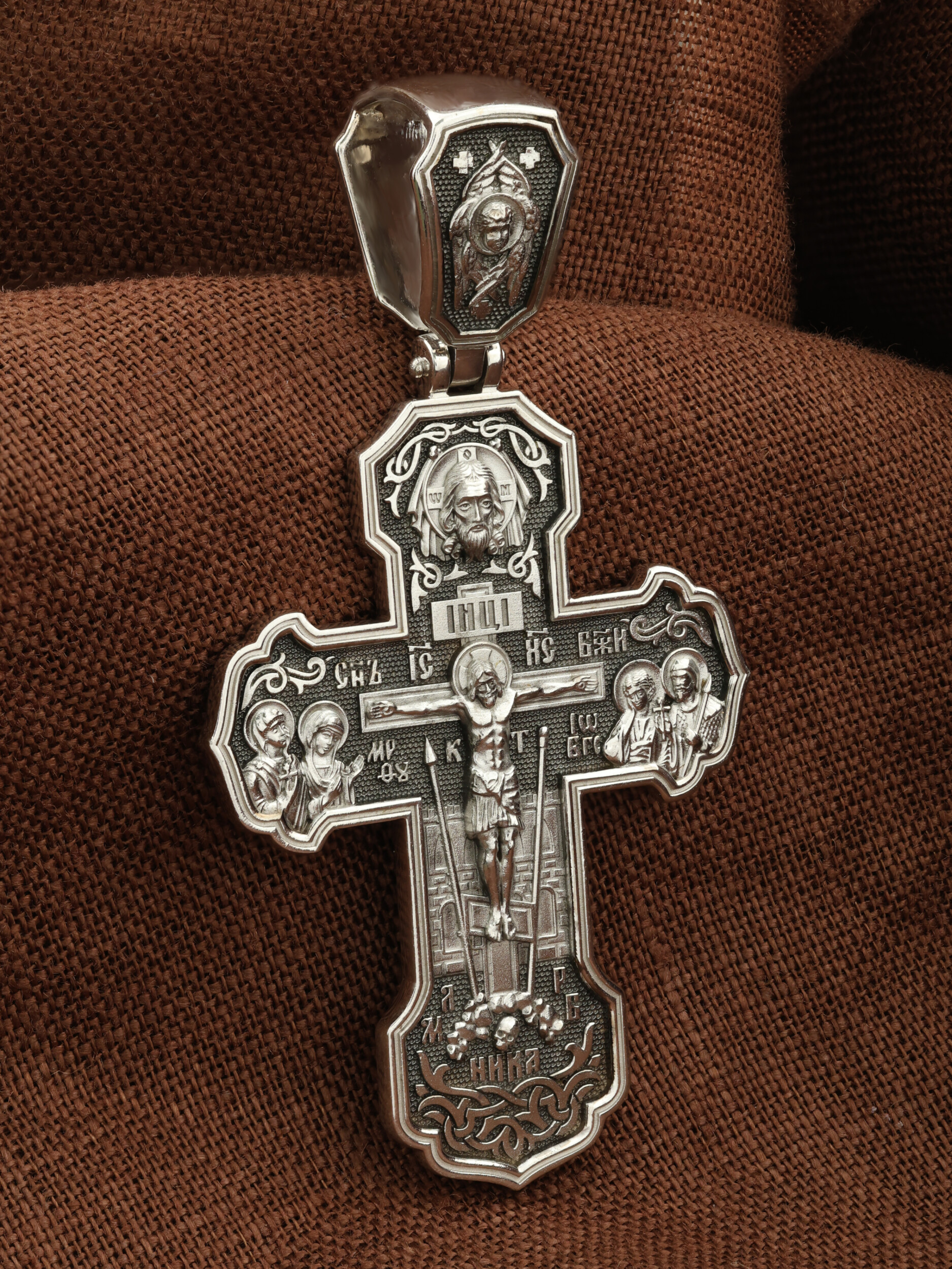 На лицевой стороне креста изображено Распятие Господа и Спасителя нашего Иисуса Христа. Крест- символ спасения и искупления рода человеческого, знамение победы над смертью и адом. Иисус Христос, как искупительная жертва освобождения человечества от власти греха, умер крестной смертью и в третий день воскрес. На верхней табличке, выше головы Иисуса, расположена надпись, составленная Понтием Пилатом — «IНЦI». Она означает «Иисус Назорей, Царь Иудейский». Надпись «IС» « ХС» означает Иисус Христос и помещается на разных сторонах поперечной (большой) перекладины креста. Рядом расположена надпись «Сын Божий». Выше Распятия изображен Нерукотворный образ Господа и Спасителя нашего Иисуса Христа. Слева от Распятия — Пресвятая Богородица и святая мироносица Мария Магдалина с крестом в руке. Справа — апостол и евангелист Иоанн Богослов, один из ближайших учеников Иисуса Христа и сотник Лонгин с крестом в правой руке и копьем — в левой. За крестом высится Иерусалимская стена. Крест стоит на горе камней, символизирующих Голгофу. В ее основании различается череп — это голова Адама. Вдоль креста изображены копие сотника Лонгина и трость с губкой и буквы «К» и «Т». Надпись «МЛРБ» — «место лобное рай бысть» означает, что место лобное стало раем и помещаются в нижней части креста. Рядом — слово «НИКА», что означает «победитель». На православном кресте Христос не умирает, а свободно простирает руки, ладони Иисуса открыты, будто он хочет обнять все человечество, даря им свою любовь и открывая путь к вечной жизни. На кулонном кольце изображен шестикрылый Серафим.