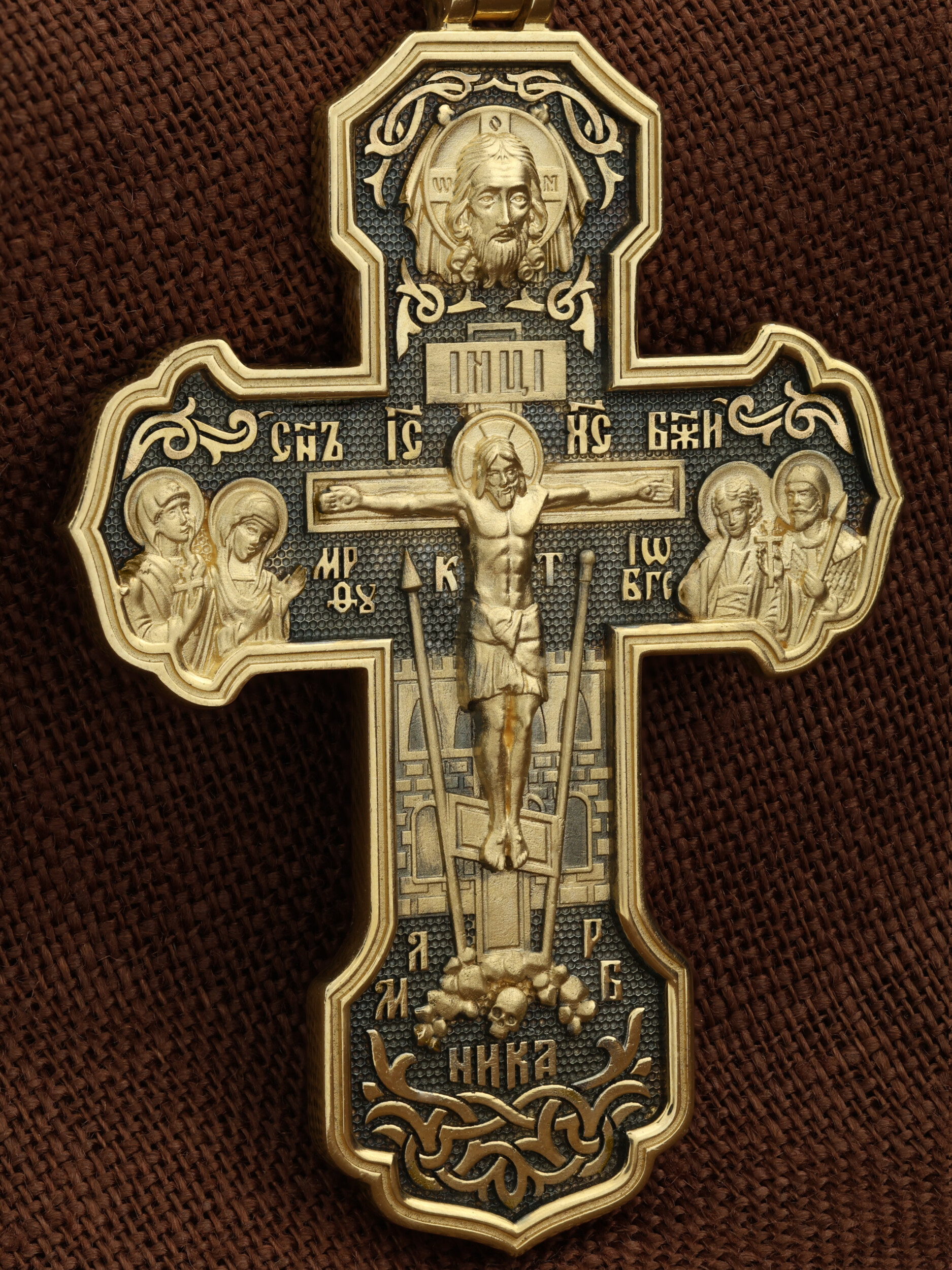 На лицевой стороне креста изображено Распятие Господа и Спасителя нашего Иисуса Христа. Крест- символ спасения и искупления рода человеческого, знамение победы над смертью и адом. Иисус Христос, как искупительная жертва освобождения человечества от власти греха, умер крестной смертью и в третий день воскрес. На верхней табличке, выше головы Иисуса, расположена надпись, составленная Понтием Пилатом — «IНЦI». Она означает «Иисус Назорей, Царь Иудейский». Надпись «IС» « ХС» означает Иисус Христос и помещается на разных сторонах поперечной (большой) перекладины креста. Рядом расположена надпись «Сын Божий». Выше Распятия изображен Нерукотворный образ Господа и Спасителя нашего Иисуса Христа. Слева от Распятия — Пресвятая Богородица и святая мироносица Мария Магдалина с крестом в руке. Справа — апостол и евангелист Иоанн Богослов, один из ближайших учеников Иисуса Христа и сотник Лонгин с крестом в правой руке и копьем — в левой. За крестом высится Иерусалимская стена. Крест стоит на горе камней, символизирующих Голгофу. В ее основании различается череп — это голова Адама. Вдоль креста изображены копие сотника Лонгина и трость с губкой и буквы «К» и «Т». Надпись «МЛРБ» — «место лобное рай бысть» означает, что место лобное стало раем и помещаются в нижней части креста. Рядом — слово «НИКА», что означает «победитель». На православном кресте Христос не умирает, а свободно простирает руки, ладони Иисуса открыты, будто он хочет обнять все человечество, даря им свою любовь и открывая путь к вечной жизни. На кулонном кольце изображен шестикрылый Серафим.