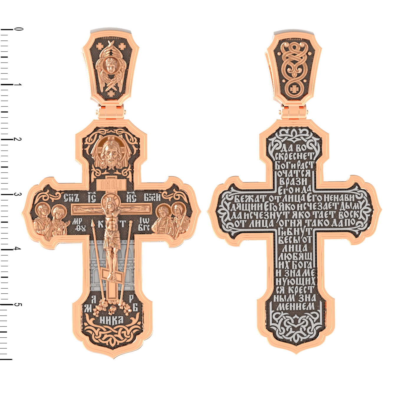 На лицевой стороне креста изображено Распятие Господа и Спасителя нашего Иисуса Христа. Крест- символ спасения и искупления рода человеческого, знамение победы над смертью и адом. Иисус Христос, как искупительная жертва освобождения человечества от власти греха, умер крестной смертью и в третий день воскрес. На верхней табличке, выше головы Иисуса, расположена надпись, составленная Понтием Пилатом — «IНЦI». Она означает «Иисус Назорей, Царь Иудейский». Надпись «IС» « ХС» означает Иисус Христос и помещается на разных сторонах поперечной (большой) перекладины креста. Рядом расположена надпись «Сын Божий». Выше Распятия изображен Нерукотворный образ Господа и Спасителя нашего Иисуса Христа. Слева от Распятия — Пресвятая Богородица и святая мироносица Мария Магдалина с крестом в руке. Справа — апостол и евангелист Иоанн Богослов, один из ближайших учеников Иисуса Христа и сотник Лонгин с крестом в правой руке и копьем — в левой. За крестом высится Иерусалимская стена. Крест стоит на горе камней, символизирующих Голгофу. В ее основании различается череп — это голова Адама. Вдоль креста изображены копие сотника Лонгина и трость с губкой и буквы «К» и «Т». Надпись «МЛРБ» — «место лобное рай бысть» означает, что место лобное стало раем и помещаются в нижней части креста. Рядом — слово «НИКА», что означает «победитель». На православном кресте Христос не умирает, а свободно простирает руки, ладони Иисуса открыты, будто он хочет обнять все человечество, даря им свою любовь и открывая путь к вечной жизни. На кулонном кольце изображен шестикрылый Серафим.