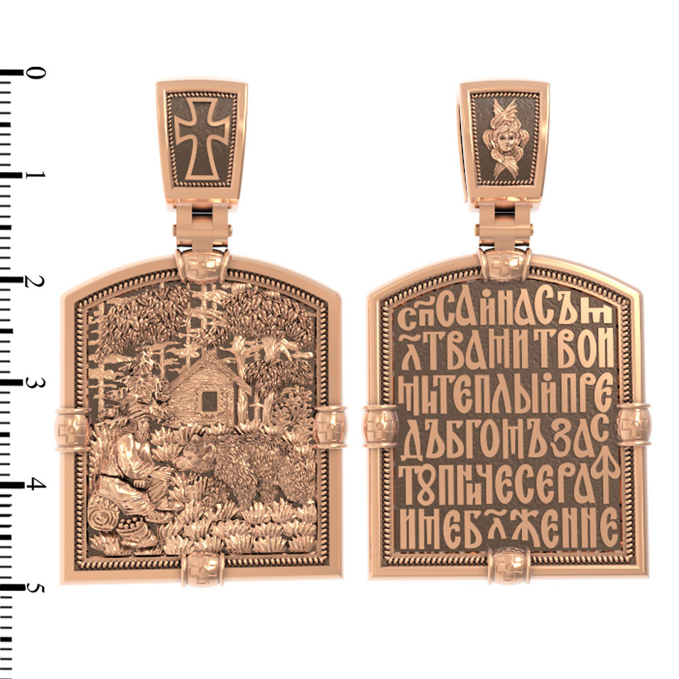 На лицевой стороне образка изображен Преподобный Серафим Саровский, самый великий русский святой XIX века. Преподобный Серафим почитается за особую милостивую любовь к людям и неоскудевающую помощь во всяких делах.
