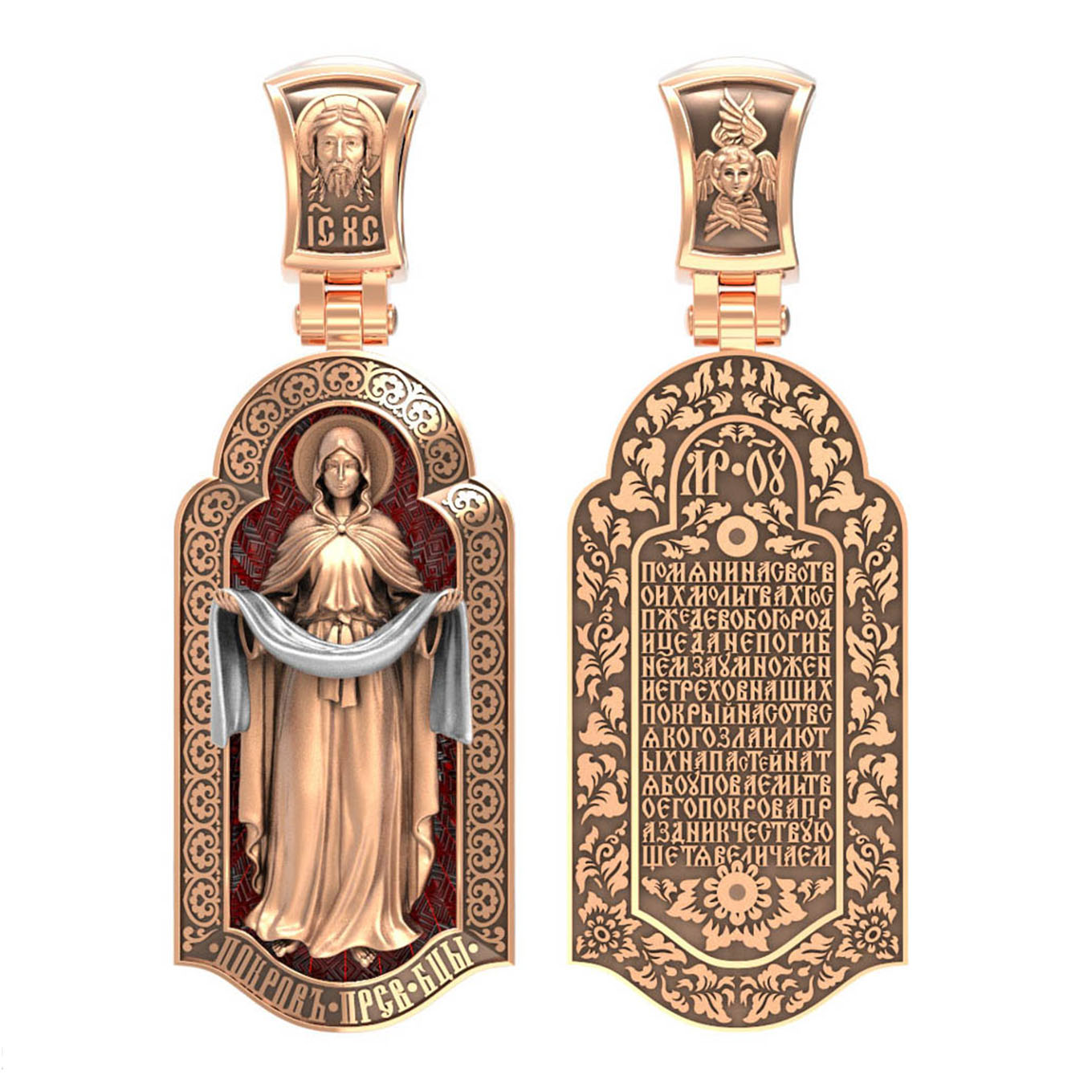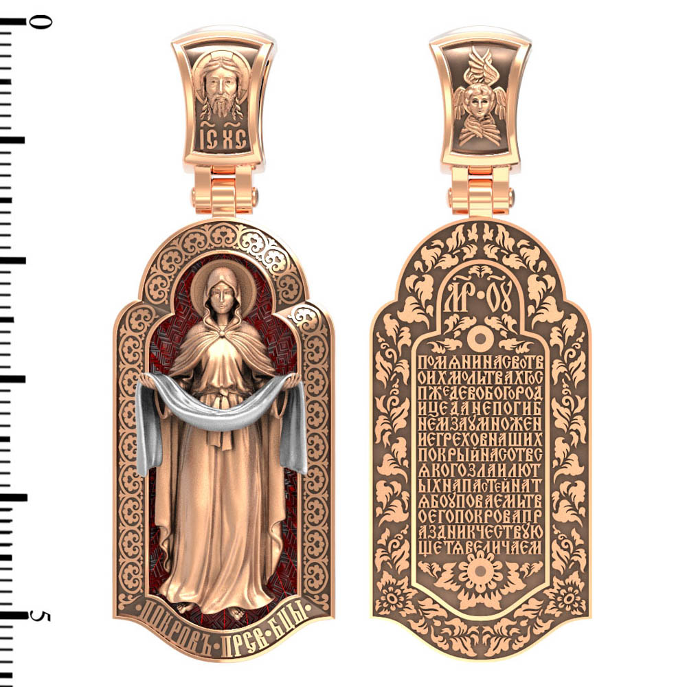 На лицевой части образка изображена икона Покров Пресвятой Богородицы. Праздник Покрова Божией Матери является воспоминанием чуда, которое произошло во Влахнернской церкви 1 (14) октября 910 года: Пресвятая Богородица явилась верующим над алтарем храма и распростерла над ними Свое покрывало. В этот день Божья Матерь открыла людям, что Она является Ходатаицей за них перед Богом. Богородица простирает Свой молитвенный покров над всеми православными христианами и умоляет Сына Своего о даровании вечного спасения каждому человеку.