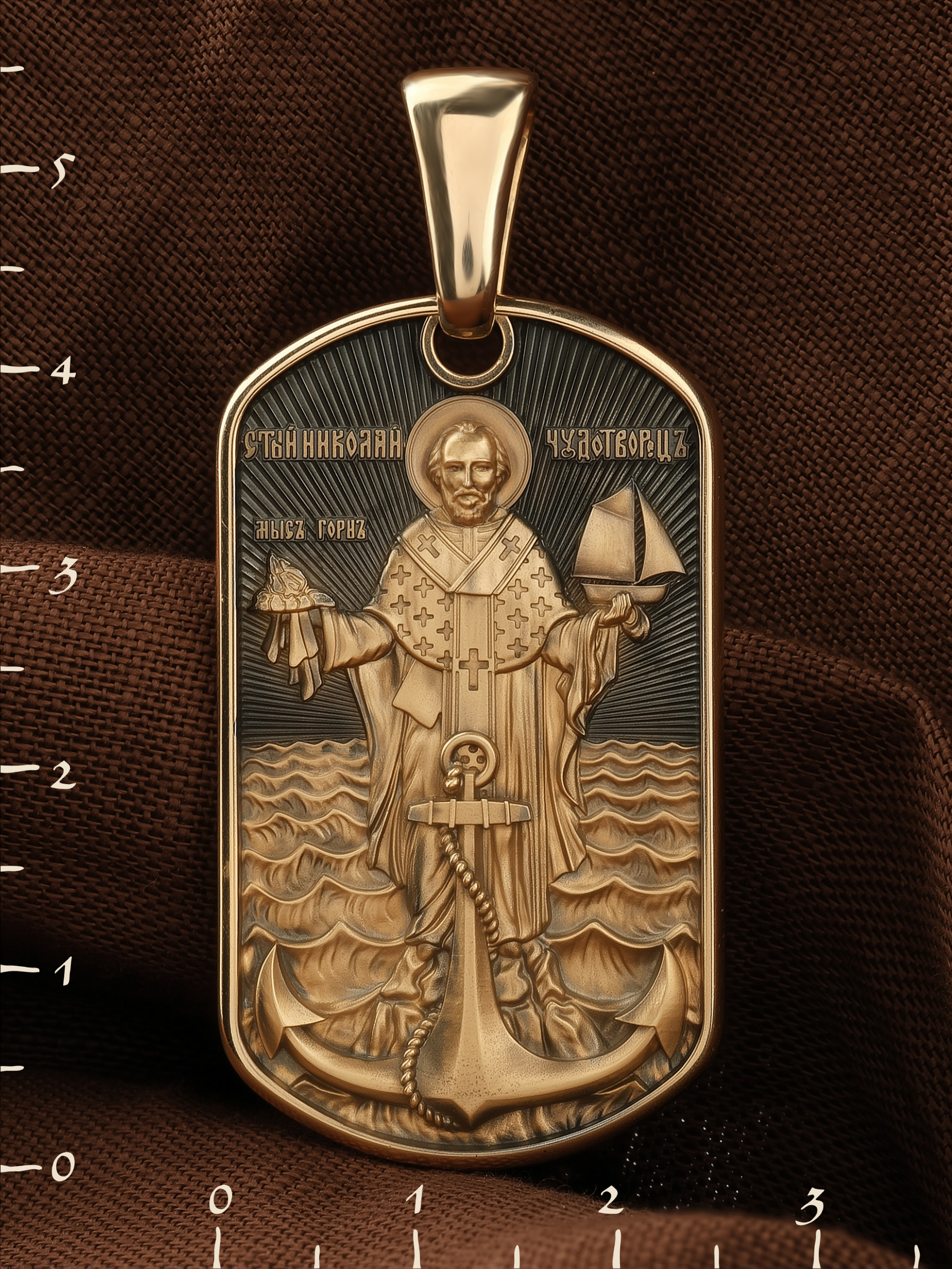 Лицевую сторону возглавляет икона Святителя Николая Чудотворца. Живший в III веке епископ Ликийского города Миры — самый почитаемый святой не только в России, но и во всем мире. Николай Чудотворец, помощник в делах, покровитель учащихся, утешитель обиженных и нуждающихся, целитель самых страшных и тяжелых недугов, предстатель и молитвенник за людей перед Богом. Также Святитель Николай Чудотворец известен своими молитвами за путешественников, когда непрестанный ветер и бушующие волны утихают и корабль заходит в спокойную гавань.