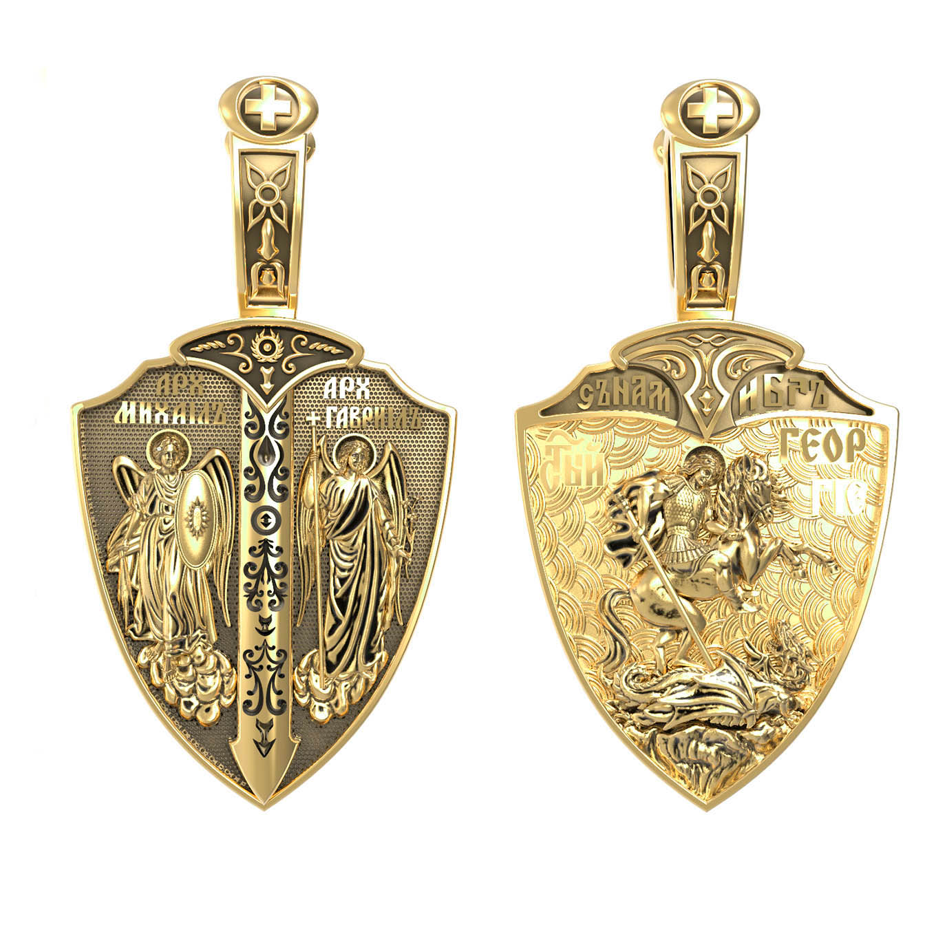 Образок выполнен в виде воинского щита и меча. На лицевой стороне образка изображены Архангел Михаил и Архангел Гавриил. Архангел Михаил изображен в воинственном виде с огненным мечом в правой руке и щитом в левой руке. Архангел Михаил — верный служитель Божий, который низринул с Неба возгордившегося денницу с другими павшими духами. В Православии его называют Архистратигом, что означает глава святого воинства Ангелов и Архангелов. Архангел почитается как покровитель воинов и всех верных Богу и ведущих борьбу против сил зла, борец против ересей, а также защитник душ умерших, страж райских врат. Архангел Гавриил изображен с крестом в правой руке и цветком лилии в левой руке. Он несколько раз упоминается в Писании, как Небесный вестник, которого Бог посылает, чтобы возвестить людям Свои планы о спасении рода человеческого. Так, Архангел Гавриил несколько раз являлся пророку Даниилу и раскрывал ему тайны пришествия Мессии, гонений антихриста и конца мира (Дан. 8, 16, 9−21). Перед пришествием Сына Божия в мир архангел Гавриил явился в храме старцу Захарии и сообщил ему о чудесном зачатии Предтечи. Через шесть месяцев он явился в Назарете Деве Марии с вестью об избрании Ее быть Матерью Христа Спасителя (Лк. 1). Когда Господь перед Своими страданиями молился в Гефсиманском саду до кровавого пота, на укрепление Его, по Церковному Преданию, был послан с Небес Архангел Гавриил. (Лк.22:43). Жены мироносицы услышали от Архистратига радостную весть о Воскресении Христовом.