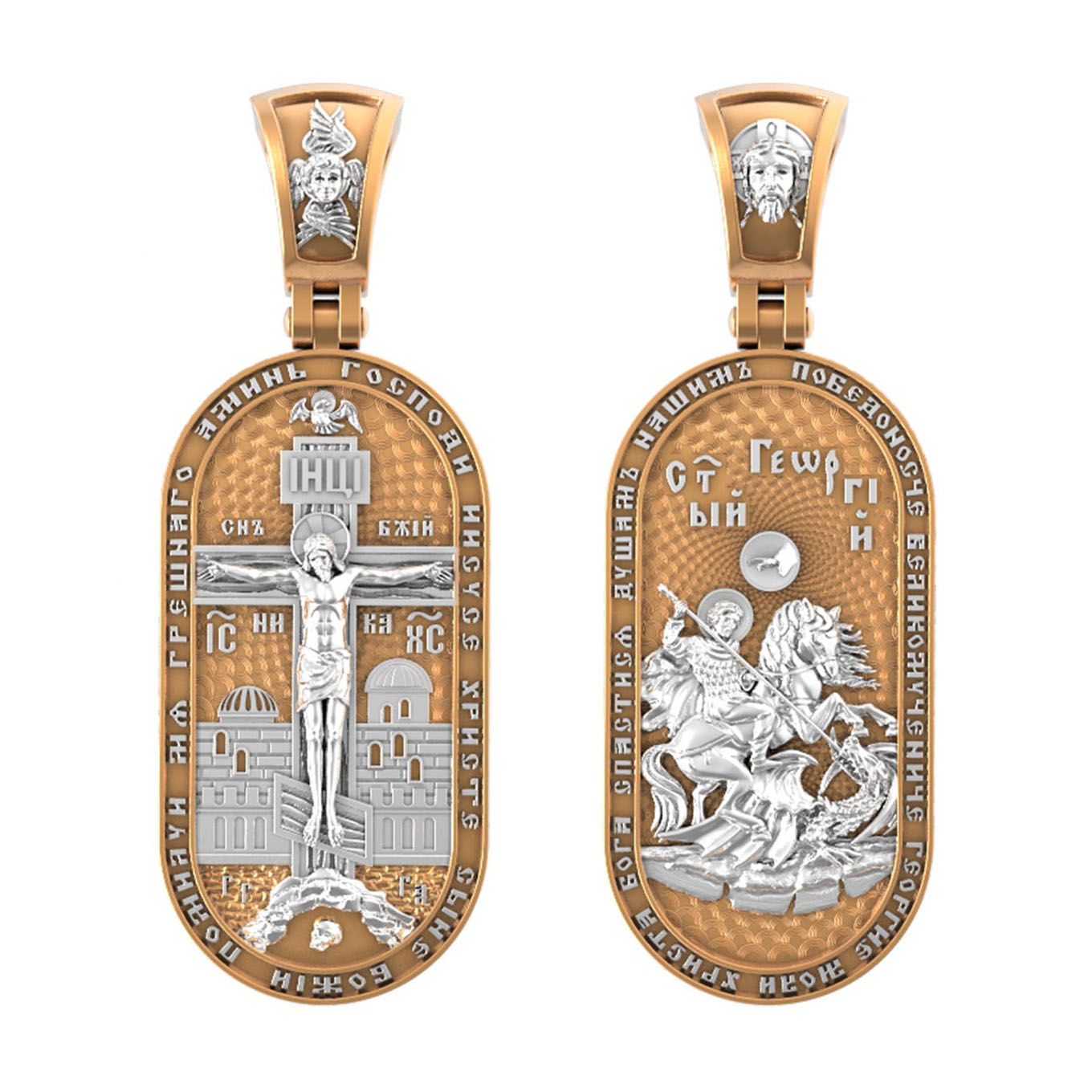 По контуру написана молитва: «Победоносче Великомучениче Георгие, моли Христа Бога спастися душам нашим». На кулонном кольце изображен Спас Нерукотворный — Символ вочеловечившегося Божества.