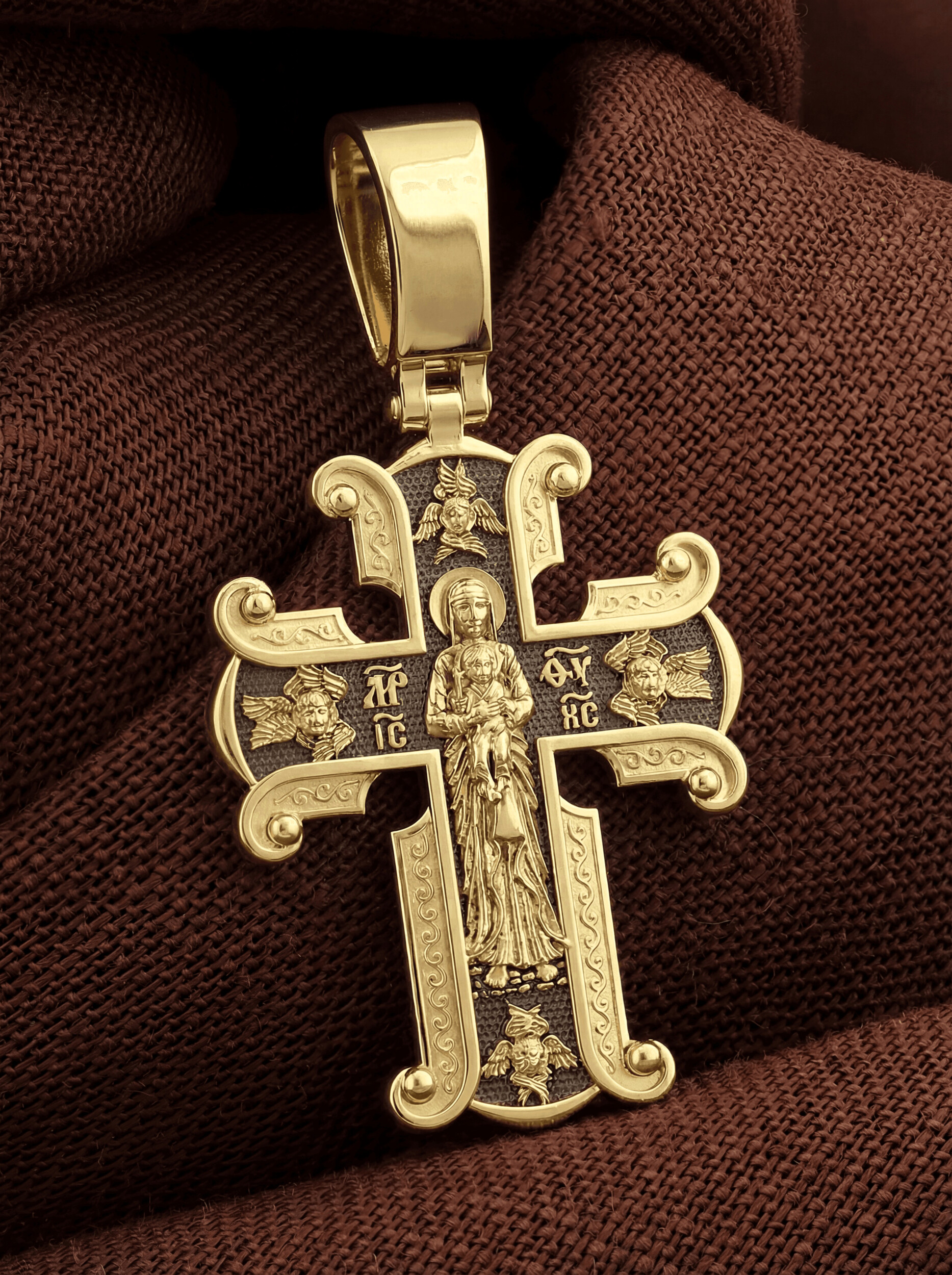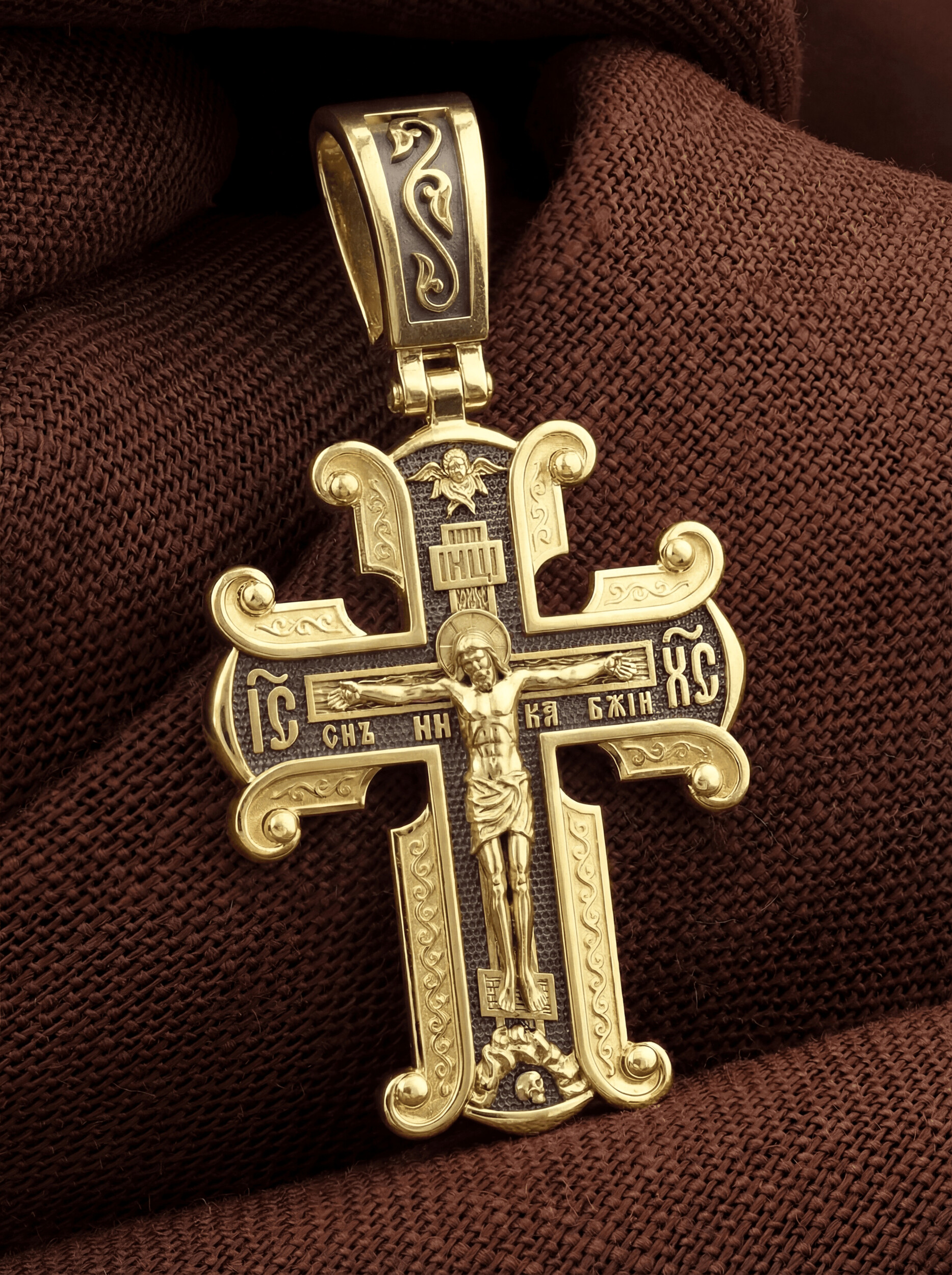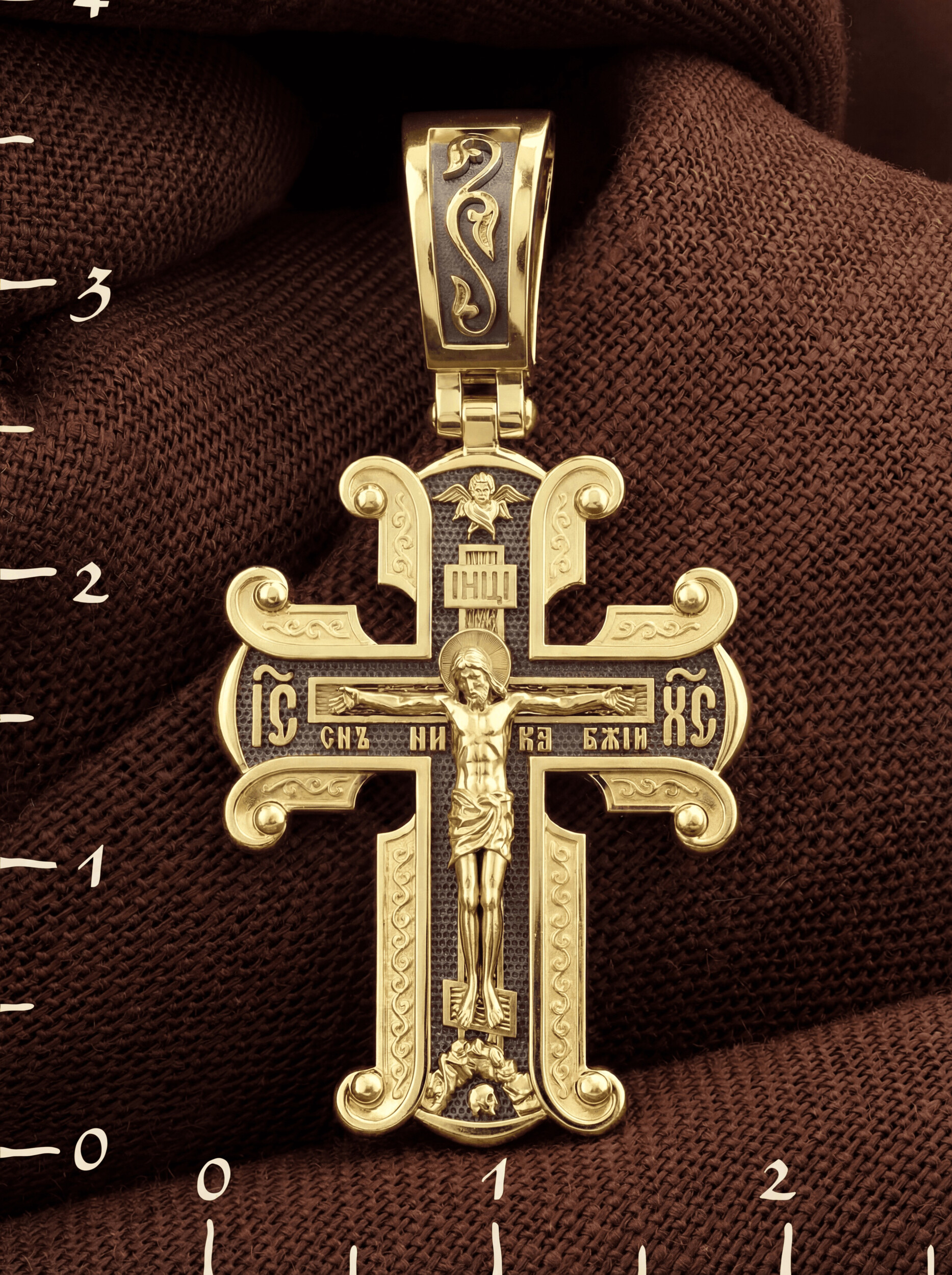 На лицевой стороне необычной формы нательного креста мы видим распятие Господне. Сам крест украшен плетением полурастительной тематики и золотым ободком, заканчивающимся завитками. На ухе с лицевой стороны надпись — Царь Славы. Под ней — шестикрылый огненный серафим, и буквы «IНЦI», означающие Иисус Назорей Царь Иудейский. С обеих сторон горизонтальной перекладины надписи — монограмма святого имени Христа — «ИС ХС», а под ней — «НИКА» (Победитель) и «Сын Божий». В подножии мы видим изображенную гору Голгофу в виде скалистой горки с Главой Адамовой в пещере.