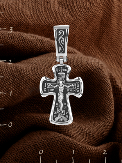 На лицевой стороне креста изображено Распятие, потому что это орудие казни Иисус Христос сделал орудием победы над грехом и смертью. Своими страданиями Он искупил грехи человечества, умерев и сошествовав во ад, победил сатану, освободил души праведников от вечной смерти и открыл им небесные врата рая. Жертва Христа сделала возможным спасение для каждого человека. На православном кресте Христос не умирает, а свободно простирает руки, ладони Иисуса открыты, будто он хочет обнять все человечество, даря им свою любовь и открывая путь к вечной жизни. Над титлом видим слова «ЦРЬ СЛВЫ» — Царь Славы. Верхняя перекладина символизирует собой табличку с надписью «IHЦI» — Иисус Назарянин Царь Иудейский. Возле перекладины пишется сокращенно имя Спасителя «IC XC» — Иисус Христос, ниже перекладины добавляется: словосочетание «СНЪ БЖІЙ» — Сын Божий и «НИКА» (греч. — Победитель). Возвышение, на котором стоит Крест, символизирует гору Голгофу, на которой произошло Распятие. У подножия Креста изображают прах Адама, обозначенный черепом.