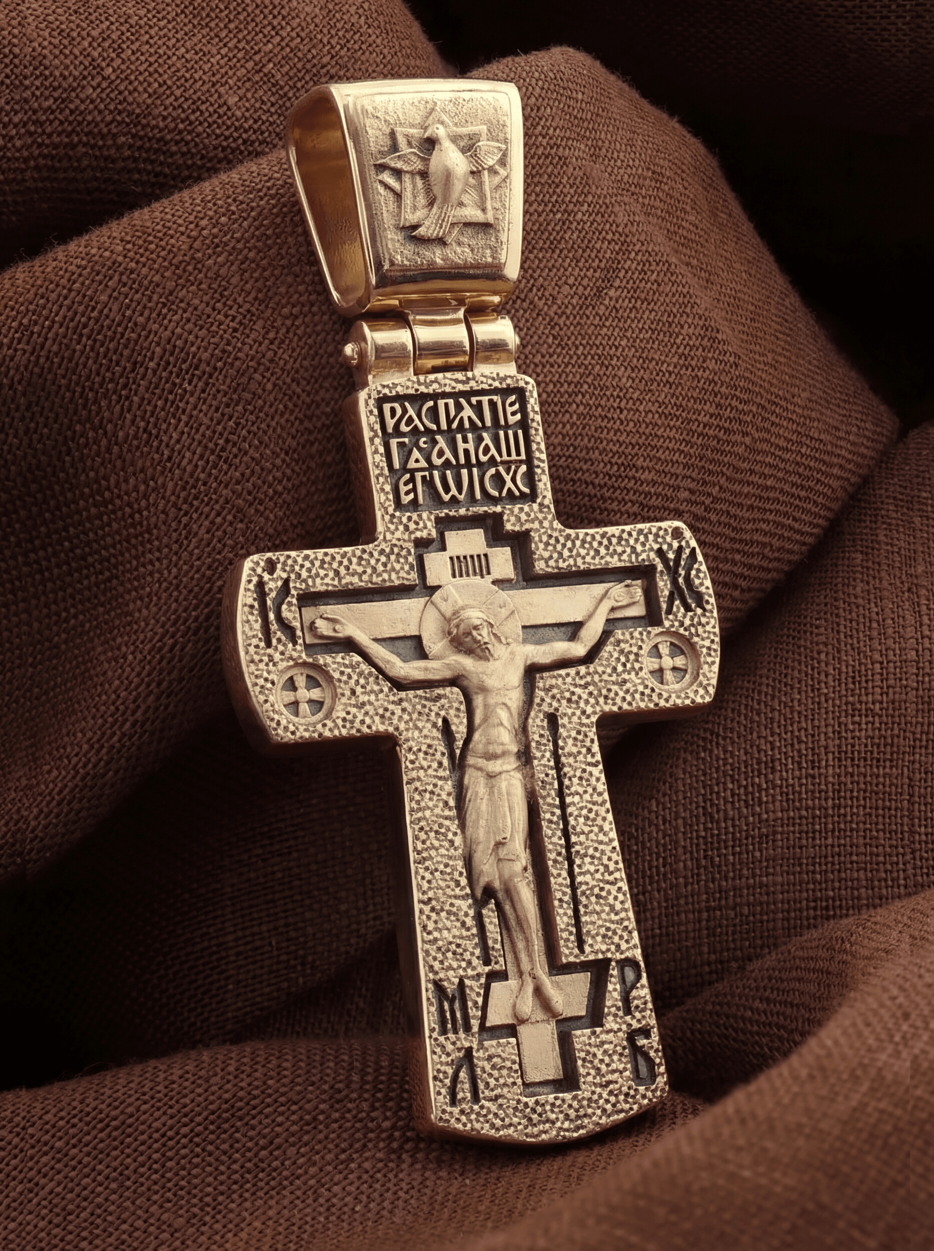 На лицевой стороне креста изображено Распятие Иисуса Христа. Господь представлен свободно покоящимся на кресте с простертыми руками и как бы обнимающим всю Вселенную. Он — Спаситель, искупивший грехи мира, «поправший смертию смерть» и призывающий к Себе «все концы земли». Верхняя перекладина символизирует титло — табличку, на которой, согласно Евангелию, было начертано: Иисус Назорей Царь Иудейский (IНЦI). Также Распятие сопровождается надписями, олицетворяющими Христа. Это святое имя Христа «IC» (Иисус) «ХС» (Христос). Возвышение, на котором стоит Крест, символизирует гору Голгофу, на которой произошло Распятие. У подножия пишутся четыре буквы «МЛ» и «РБ» — «Место Лобное» и «Рай Бысть».