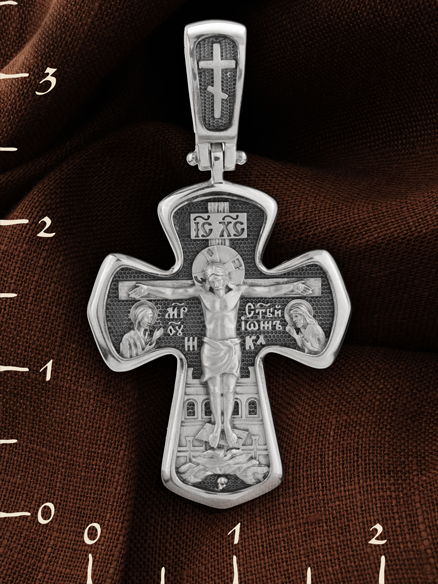На лицевой стороне креста изображено Распятие Господа и Спасителя нашего Иисуса Христа, отдавшего Себя на смерть, для искупления грехов мира. Господь сказал: кто хочет идти за Мною, отвергнись себя, и возьми крест свой, и следуй за Мною. (Мк. 8: 34). Крест является символом жертвенной любви всеблагого Бога к падшим людям, всепобеждающим духовным оружием христиан, основанием и средоточием церковной жизни. На верхней перекладине помещена надпись «IС» « ХС», что означает Иисус Христос. Ниже — слово «НИКА», что означает «победитель». Слева от Распятия изображена Пресвятая Богородица, справа — апостол и евангелист Иоанн Богослов, один из ближайших учеников Иисуса Христа. За Распятием высится Иерусалимская стена, в знак того, что Господь был распят вне стен города. Возвышение, на котором стоит Крест, символизирует гору Голгофу, на которой произошло Распятие. Под подножием Креста изображена покоящаяся голова (череп) Адама. На кулонном кольце помещен крест.