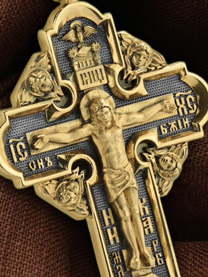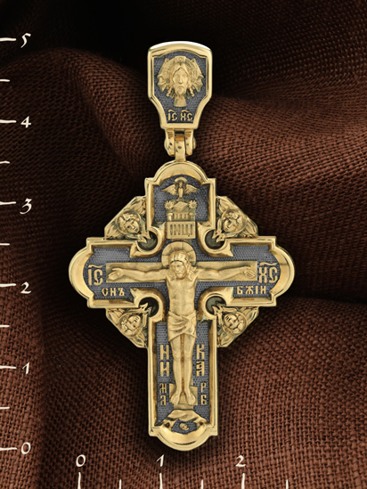 На лицевой стороне креста изображено Распятие Господа и Спасителя нашего Иисуса Христа, отдавшего Себя на смерть, чтобы другие могли жить — жить вечной жизнью, жить с Богом. Своею кровью Господь освятил крест и сделал его проводником Своей благодати, источником освящения верующих. На верхней табличке, выше головы Иисуса, расположена надпись, составленная Понтием Пилатом — «ИНЦИ». Она означает «Иисус Назорей, Царь Иудейский». Надпись «IС ХС» означает Иисус Христос помещается на разных сторонах поперечной (большой) перекладины креста. На кулонном кольце помещено изображение Духа Святого в виде голубя, сходящего с Небес