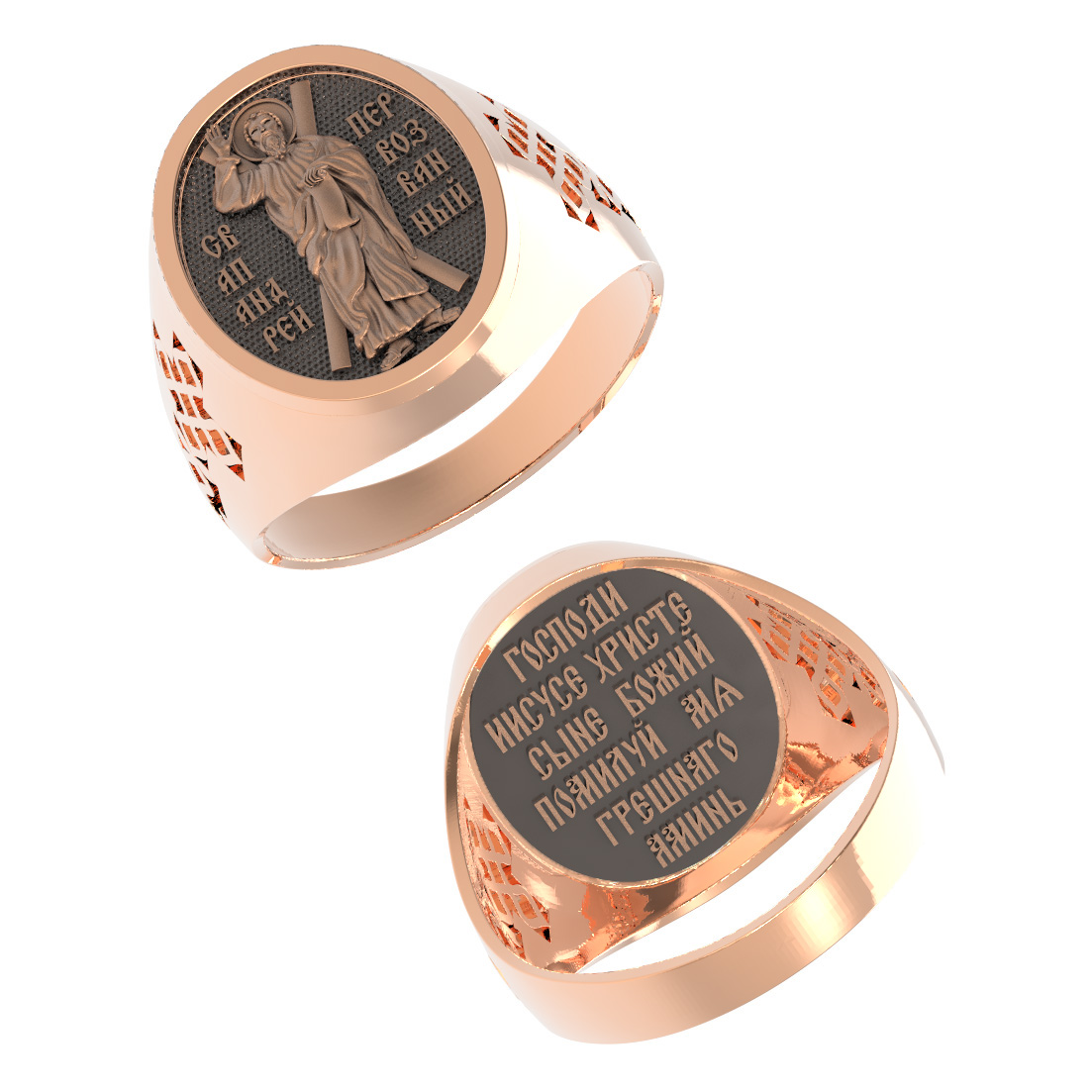 На лицевой стороне кольца помещен образ святого апостола Андрея Первозванного. Позади изображен Крест, на котором он был распят. Святой апостол Андрей Первозванный первым из апостолов последовал за Христом, а затем привел к нему своего родного брата — святого апостола Петра (Ин.1:35−42). С юности будущий апостол, который был родом из Вифсаиды, всей душой обратился к Богу. Он не вступил в брак и весте со своим братом занимался рыболовством. Когда над Израилем прогремел глас святого пророка, Предтечи и Крестителя Господня Иоанна, святой Андрей стал его ближайшим учеником. Святой Иоанн Креститель сам направил двух своих учеников, будущих апостолов Андрея Первозванного и Иоанна Богослова, ко Христу, указав, что Он есть Агнец Божий. После Сошествия Святого Духа на апостолов святой Андрей отправился с проповедью Слова Божия в восточные страны. Прошел Малую Азию, Фракию, Македонию, дошел до Дуная, прошел побережье Черного моря, Крым, Причерноморье и по Днепру поднялся до места, где стоит теперь город Киев. Апостол дошел до поселений славян, где был основан Новгород. Отсюда апостол прошел через земли варягов в Рим для проповеди и вновь вернулся во Фракию, где в небольшом селении Византии, будущем могучем Константинополе, основал христианскую Церковь. В греческом городе Патры по приказу правителя-язычника Эгеата Андрей Первозванный был распят на Кресте, но в течение трёх последующих дней оставался живым и поучал людей. Только после молитвы к Богу о том, чтобы он забрал его к себе, Андрей Первозванный принял мученическую смерть. Имя святого апостола Андрея связывает мать — Церковь Константинопольскую с ее дочерью — Русской Церковью.