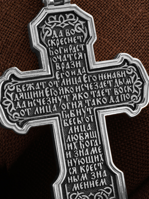 На оборотной стороне креста написана молитва Честному Кресту Господню: «Да воскреснет Бог, и расточатся врази Его, и да бежат от лица Его ненавидящии Его. Яко исчезает дым, да исчезнут; яко тает воск от лица огня, тако да погибнут беси от лица любящих Бога и знаменующихся крестным знамением…».