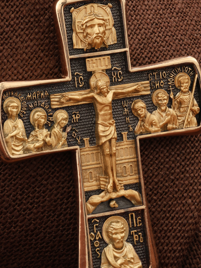 На лицевой стороне креста изображено Распятие Господа Иисуса Христа с предстоящими Ему святыми, которые, по преданию, находились у Креста Господа во время Его казни. Слева — Пресвятая Богородица и жены-мироносицы — равноапостольная Мария Магдалина и святая Мария Клеопова, справа — апостол Иоанн Богослов, прав. Иосиф Аримофейский и мч. Лонгин Сотник.