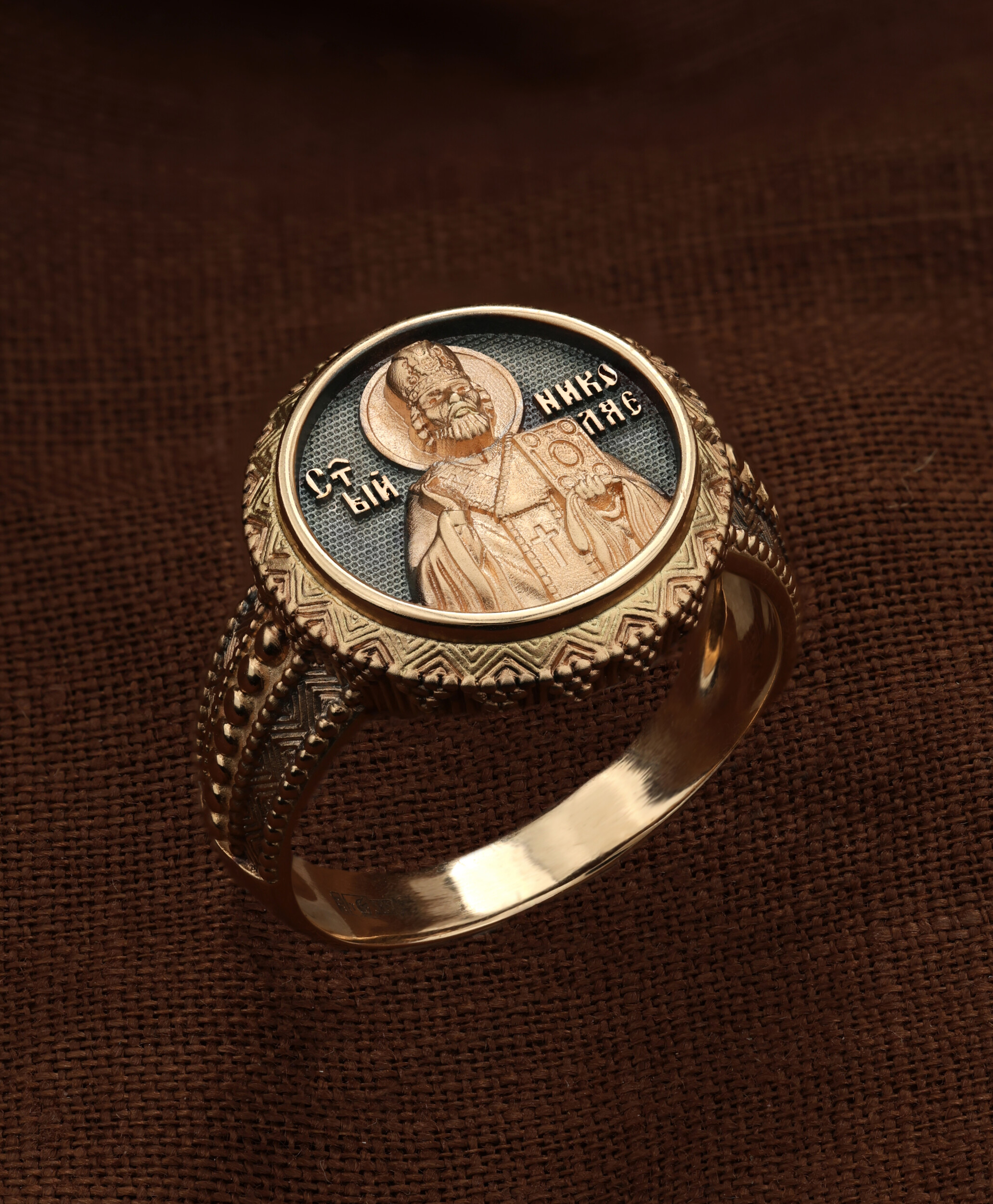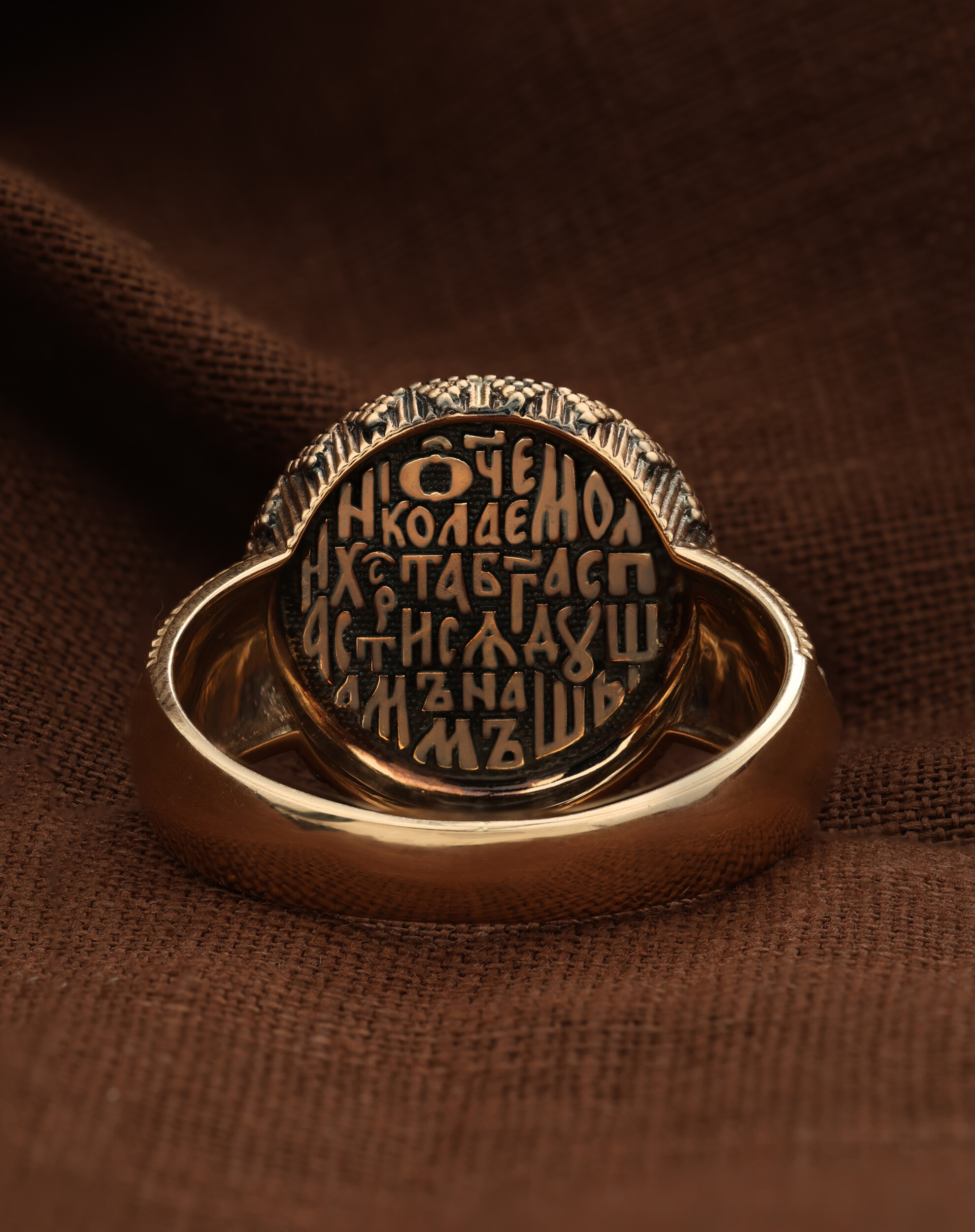 С внутренней стороны кольца выгравирована молитва: «Отче Николае, моли Христа Бога спастися душам нашим».