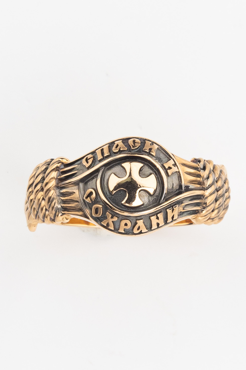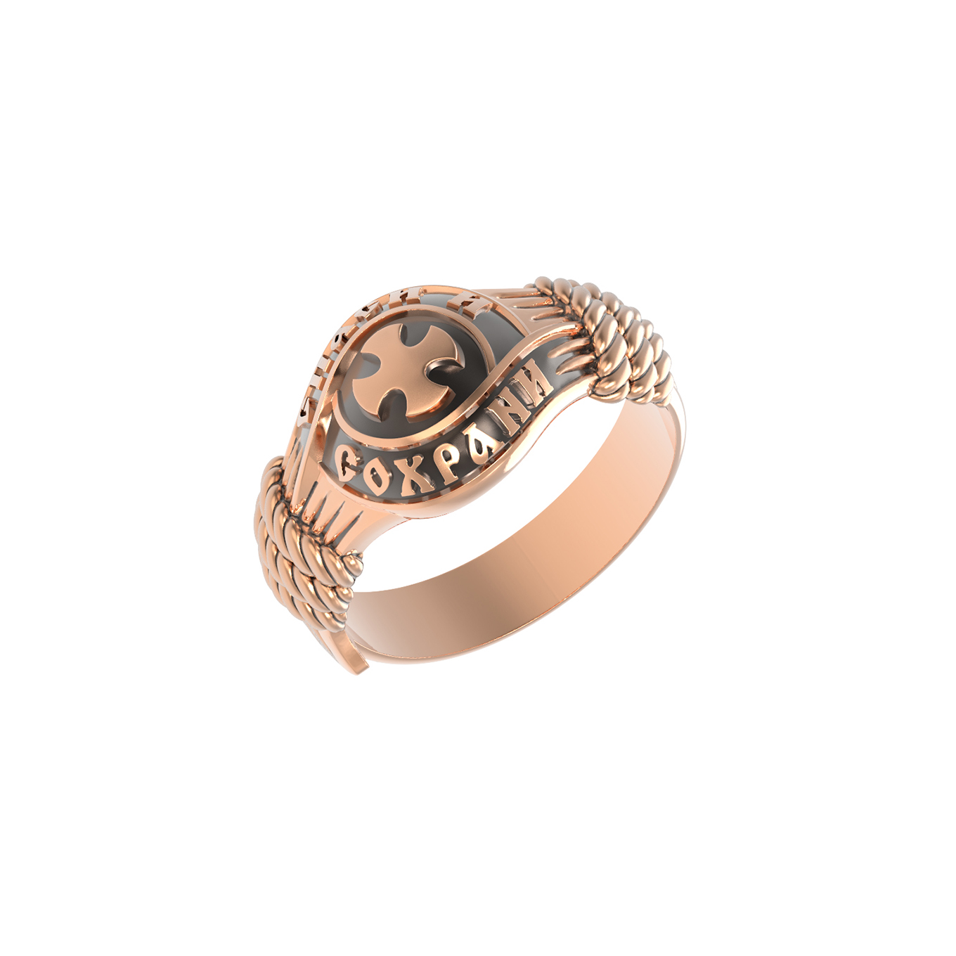 В центральной части лицевой стороны кольца изображен Крест. Господь сказал: кто хочет идти за Мною, отвергнись себя, и возьми крест свой, и следуй за Мною. Крест является символом жертвенной любви Всеблагого Бога к падшим людям, всепобеждающим духовным оружием христиан, основанием и средоточием церковной жизни. Иисус Христос, как искупительная жертва освобождения человечества от власти греха, умер крестной смертью и в третий день воскрес. Крест имеет четырехконечную форму с равными балками. Такого типа кресты существовали во многих дохристианских культурах и были в первую очередь использованы Церковью для выражения идеи христианского преобразования мира. Вокруг креста помещена молитва: «Спаси и Сохрани».