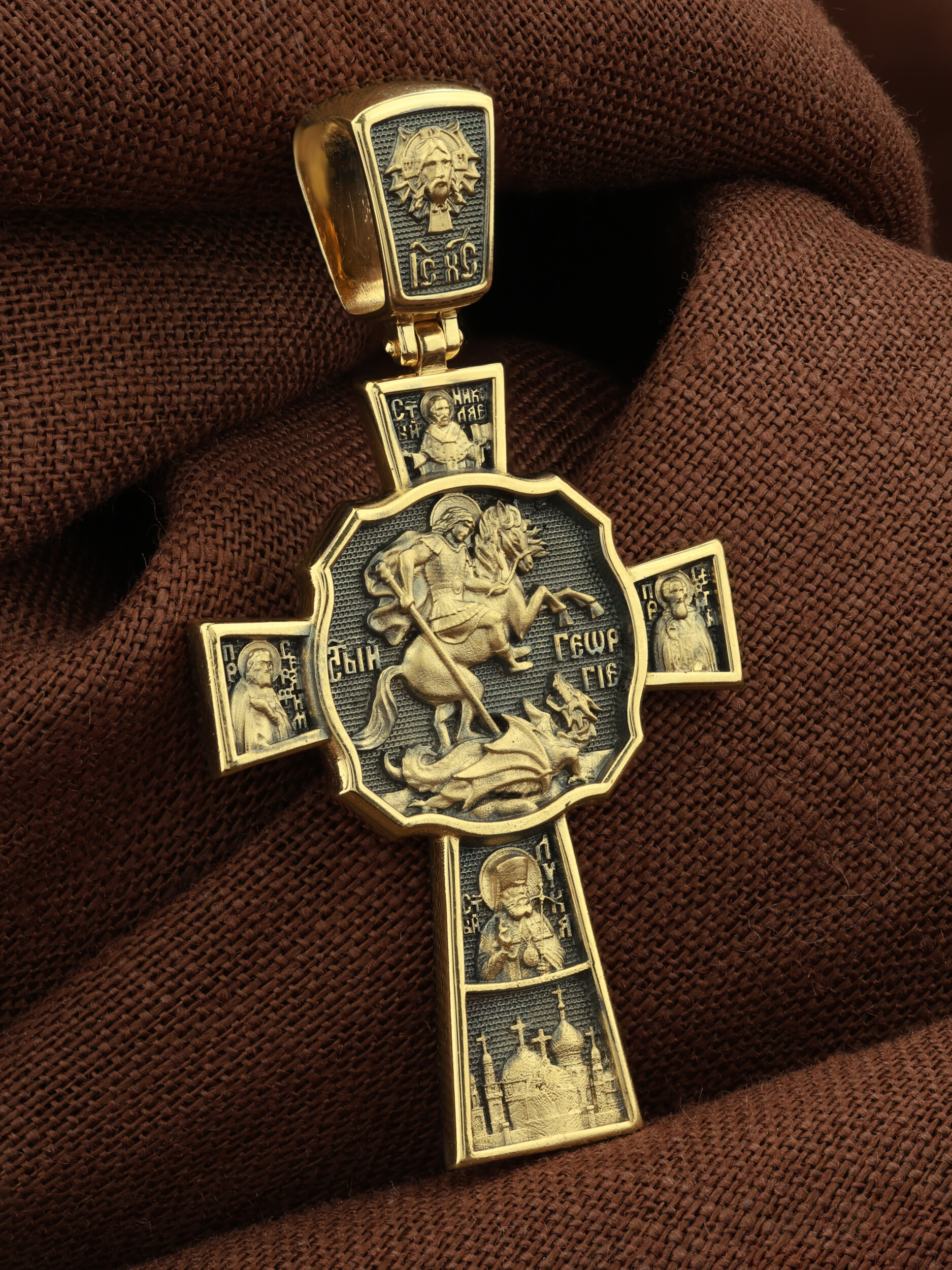 В центре оборотной стороне креста помещен образ Святого Великомученика Георгия Победоносца — одного из самых почитаемых и удивительных святых. На образке он изображен как воитель поражающий копьем огнедышащего змея. Змей символизирует собою сатанинские силы. Справа помещен образ Святого Преподобного Сергия, игумена Радонежского, чудотворца, слева — Преподобного Серафима Саровского, чудотвореца. Выше помещен образ Святителя Николая архиепископа Мир Ликийских, чудотвореца, ниже — образ святителя Луки (Войно-Ясенецкого), архиепископа Симферопольского и Крымского, исповедника и изображение Храма. На кулонном кольце изображен Спас Нерукотворный — образ Господа и Спасителя нашего Иисуса Христа, чудесно отпечатавшийся на плате, котором Христос вытер свой лик.