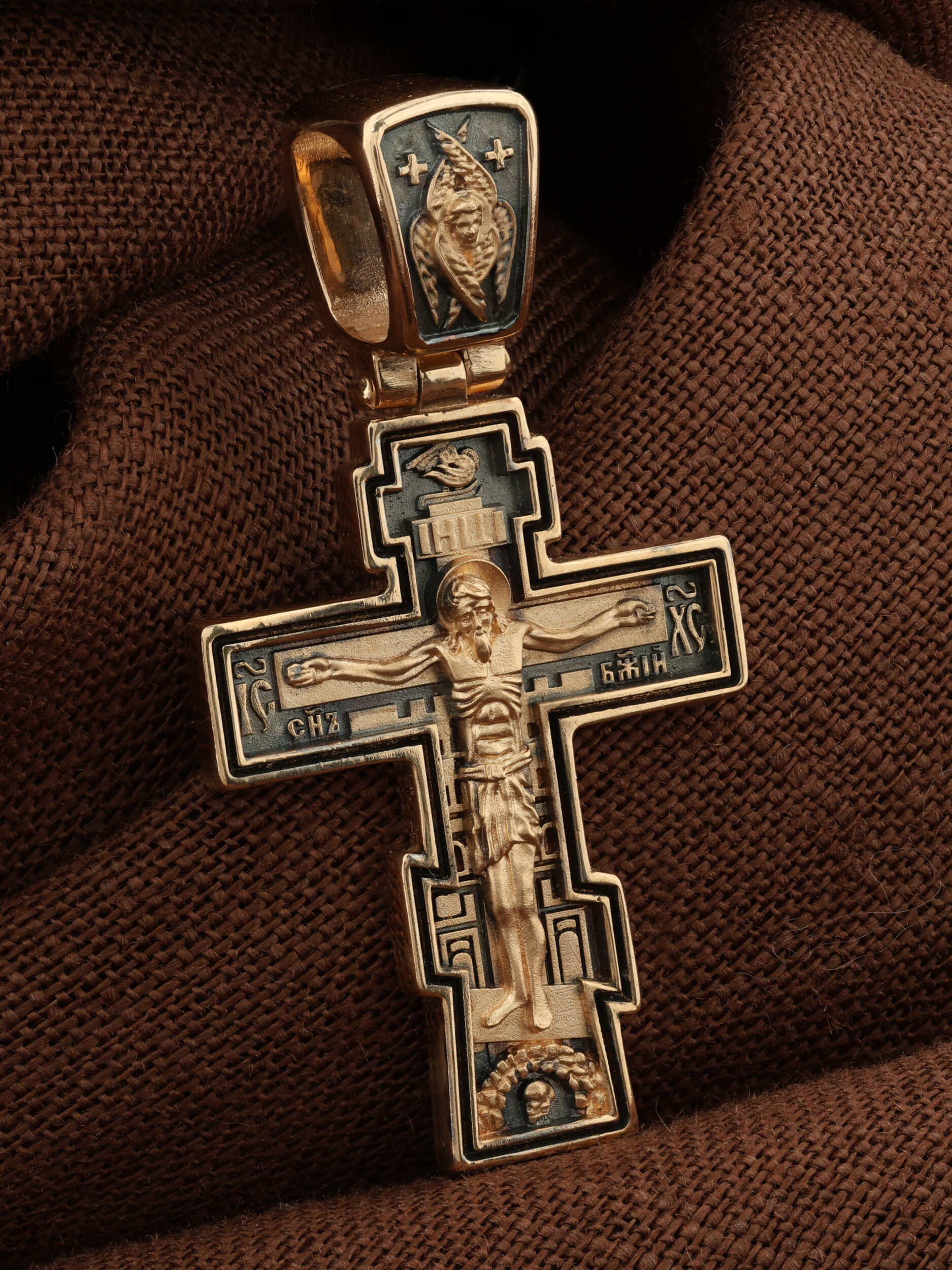 Восьмиконечный нательный крест с Распятием Иисуса Христа на горе Голгофе. Форма этого кресты является одной из самых распространенных на Руси и более всего соответствует тому Кресту, на котором был распят Христос.