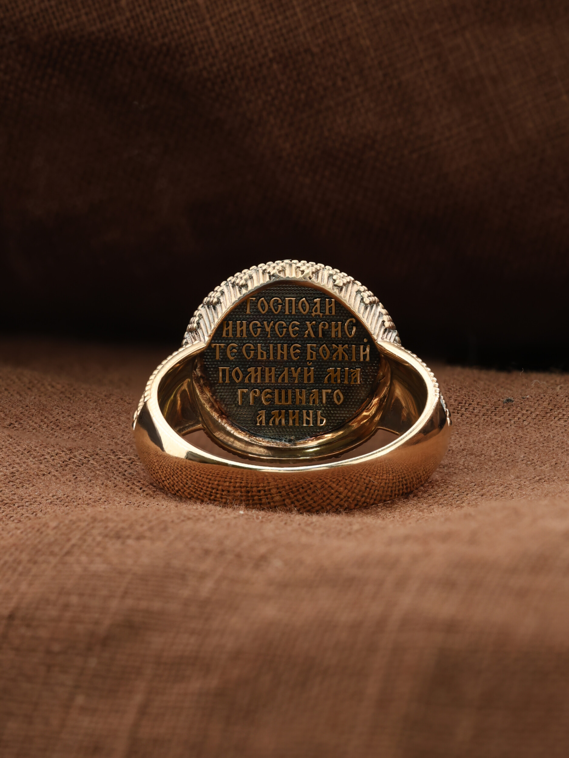 Кольцо «Господь Вседержитель» выполнено в древних христианских традициях. Господь Вседержитель или Пантократор (от греч. всевластный, всесильный). Он представлен как Царь Небесный и будущий Судия мира. Именование Иисуса «Вседержителем» указывает, с одной стороны, на Его Божественную природу: «Аз есмь Альфа и Омега, начало и конец, говорит Господь, Который есть и был и грядет, Вседержитель» (Откр. 1: 8). С другой стороны, такое именование связано и с человеческой природой Христа, искупившего крестной жертвой людские грехи и обновившего тем самым человеческую природу. Господь Иисусь Христос изображен фронтально огрудно. Главу Спасителя осеняет нимб, на нем угадывается крест. Крест символизирует голгофскую жертву Спасителя. По греческой традиции, на нимбе написаны буквы Омега, Омикрон, Ню — вместе они обозначают слово Сущий, одно из имен и характеристику Бога, согласно Священному Писанию. Правой рукой Он благословляет, а левой держит Евангелие — благую весть, принесенную Христом всему миру. Также означает она тот новый мир, который будет сотворен Богом после второго пришествия Христа. Символизирует и Книгу Жизни, где записаны имена всех, возлюбивших Бога. Всемогущий Бог предстает здесь не как обличающий судья, а как милостивый отец, ждущий возвращения блудных детей.