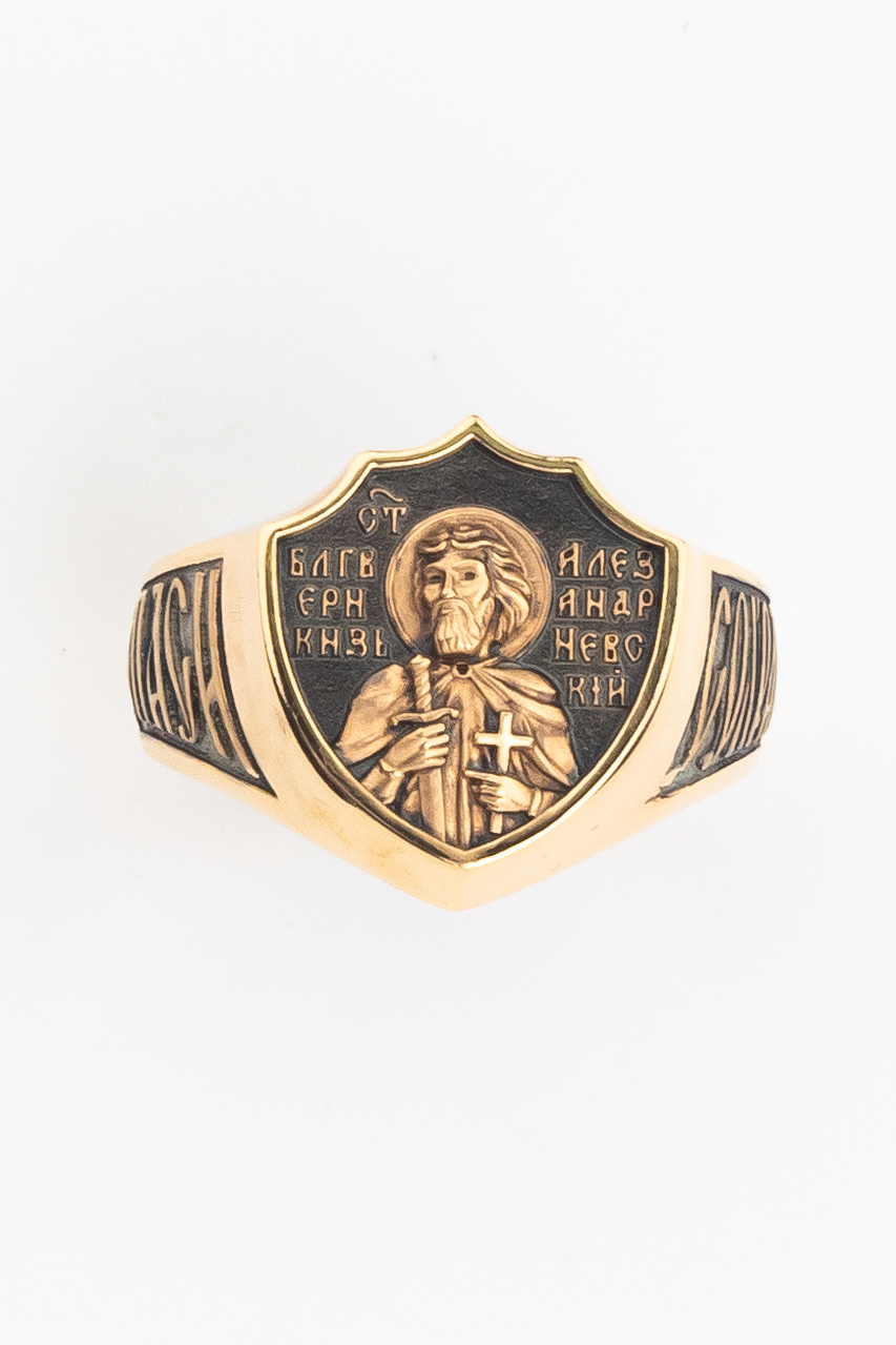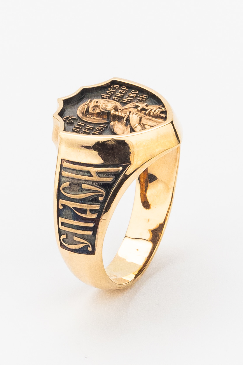 С внутренней стороны кольца изображен «Голгофский крест». Центральным и главным элементом композиции лицевой стороны является восьмиконечный крест — образ Честного и Животворящего Креста Господня, установленного на горе Голгофе. В основании креста изображена гора Голгофа, на которой был распят Спаситель и череп Адама, чьи кости по приданию омыла кровь Иисуса Христа. Перед головой располагаются лежащие кости рук, изображаются правая на левой, как при погребении или причащении. В XVI веке на Руси около изображения Голгофы появились обозначения «М.Л.Р.Б.» — Место Лобное Рай Бысть (Голгофа в переводе с еврейского — Лобное место). Чуть ниже справа и слева буквы «Г.Г.» — гора Голгофа.