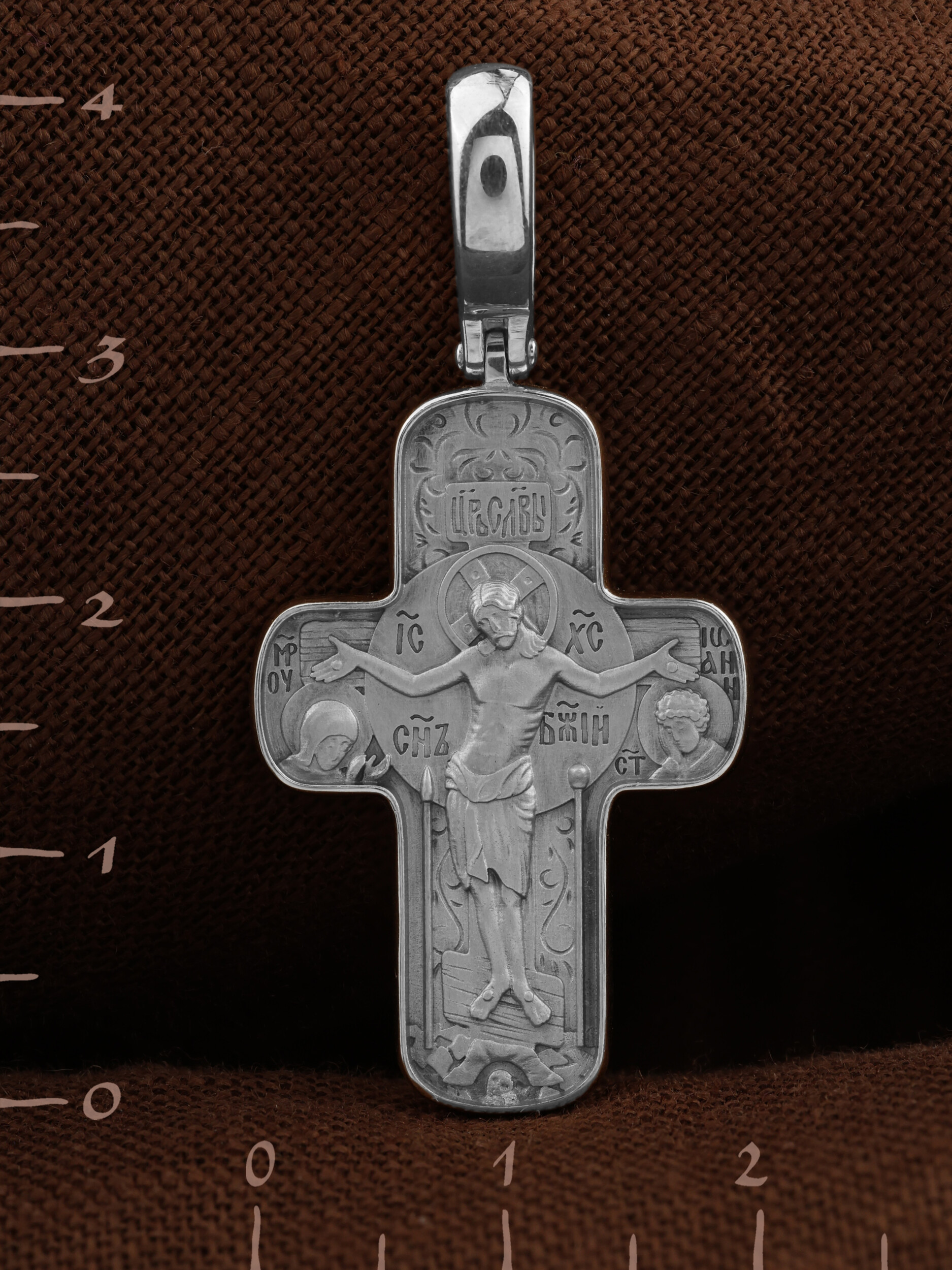 На лицевой стороне креста изображено Распятие Господа и Спасителя нашего Иисуса Христа. Крест- символ спасения и искупления рода человеческого, знамение победы над смертью и адом. Иисус Христос, как искупительная жертва освобождения человечества от власти греха, умер крестной смертью и в третий день воскрес. Над вершиной Распятия помещена надпись «Царь Славы». Надпись «IС» « ХС» означает Иисус Христос и помещается на разных сторонах поперечной перекладины креста. Рядом расположена надпись «Сын Божий». Слева от Распятия изображена Пресвятая Богородица, справа — апостол и евангелист Иоанн Богослов, один из ближайших учеников Иисуса Христа. Крест стоит на горе камней, символизирующих Голгофу. В ее основании различается череп — это голова Адама. Вдоль креста изображены копие сотника Лонгина и трость с губкой. На православном кресте Христос не умирает, а свободно простирает руки, ладони Иисуса открыты, будто он хочет обнять все человечество, даря им свою любовь и открывая путь к вечной жизни.