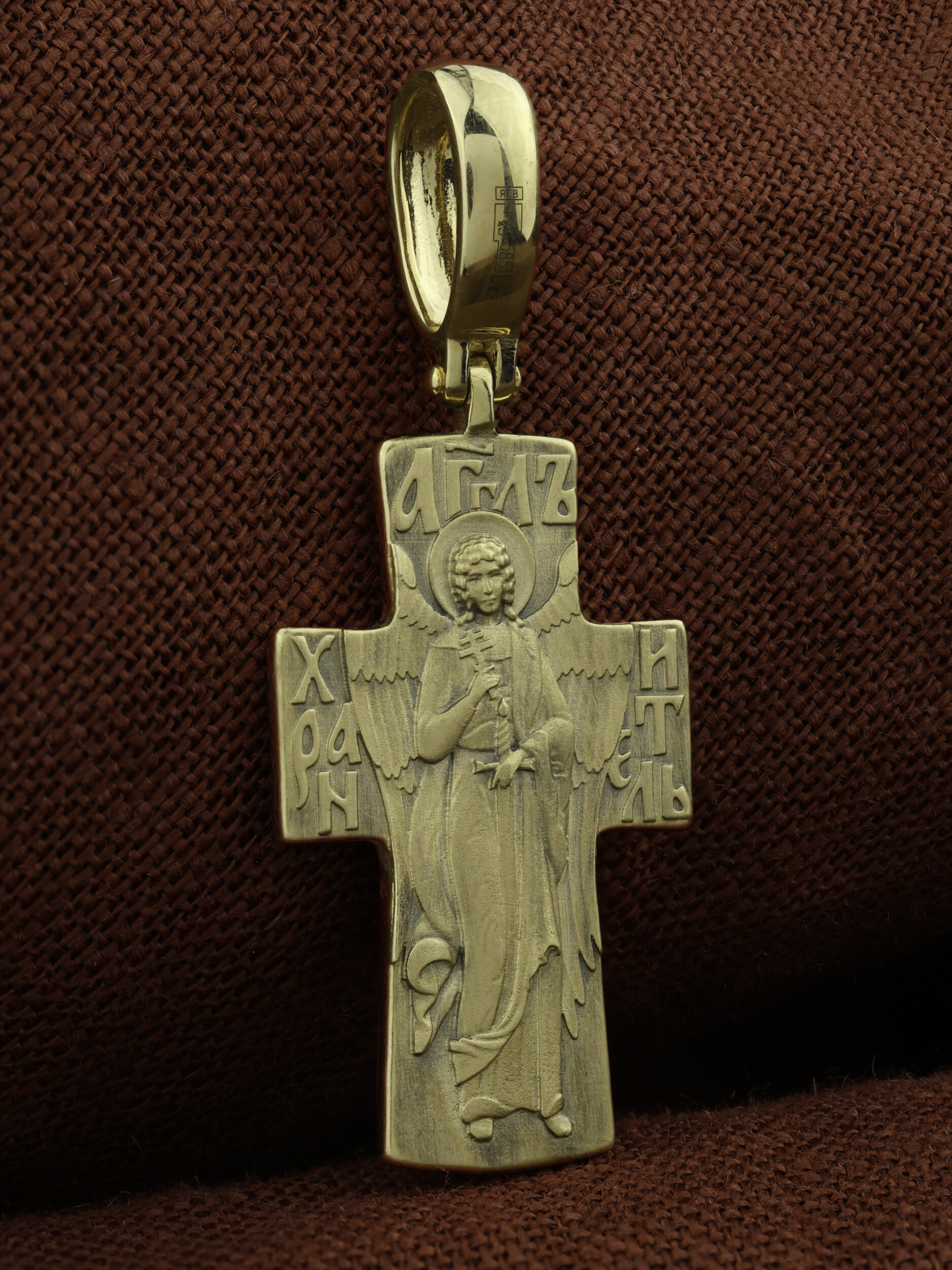 На оборотной стороне креста изображен Святой Ангел-Хранитель. Это Ангел приставляемый Богом к человеку при крещении для охраны и помощи в добрых делах. Он невидимо находится при человеке на протяжении всей его жизни, если человек сохраняет в себе любовь к Богу и истинную веру перед Ним. Ангел-Xранитель делают для нас все, что служит к истинному нашему благу и спасению. Невидимо пребывая при нас постоянно, он наставляет нас на все доброе и полезное, возносит наши молитвы к Богу, охраняют и защищают нас от врагов видимых и невидимых, ходатайствует за нас пред Богом.