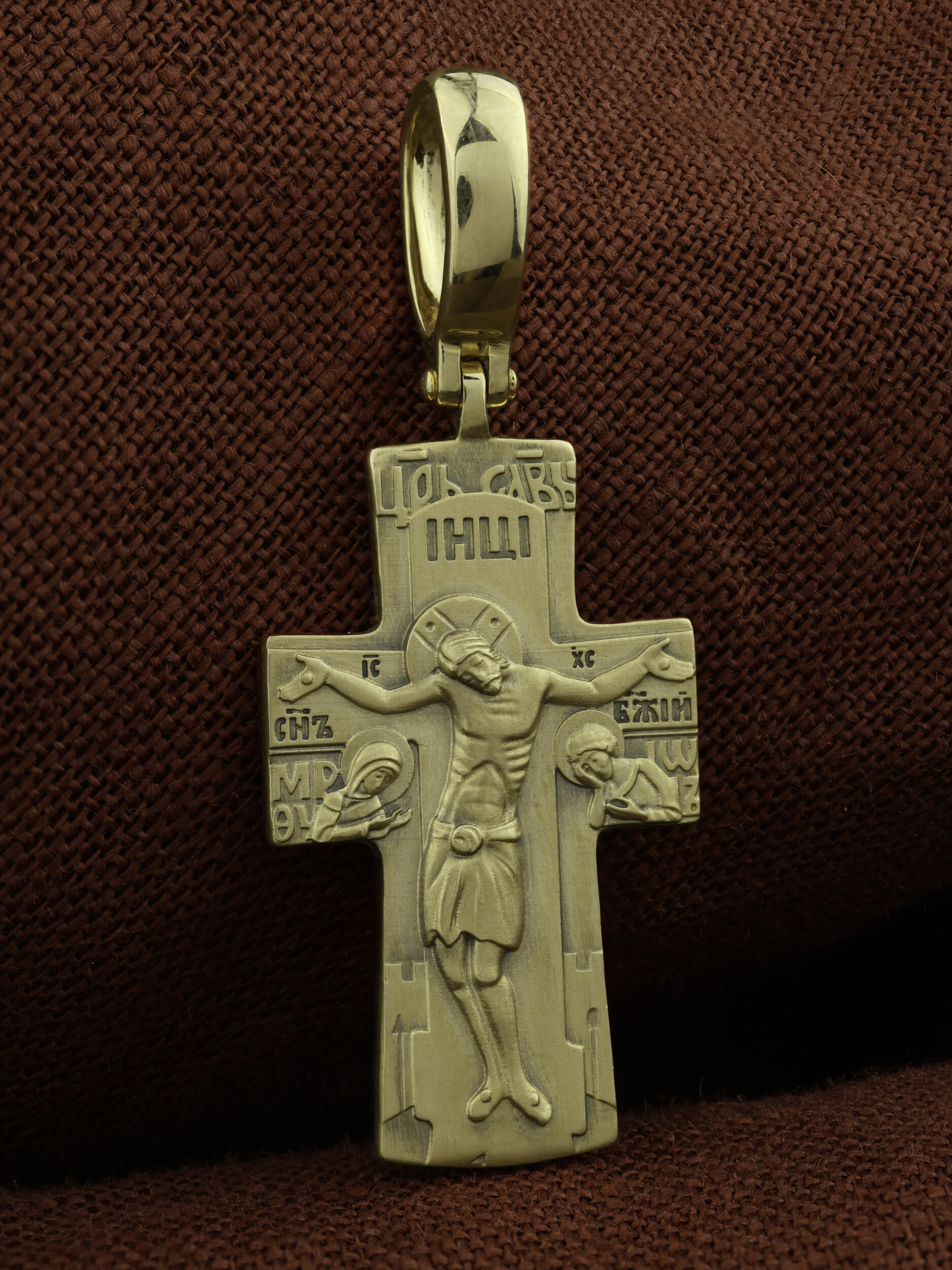На лицевой стороне креста изображено Распятие Господа и Спасителя нашего Иисуса Христа, отдавшего Себя на смерть, для искупления грехов мира. Крест является символом жертвенной любви Всеблагого Бога к падшим людям, всепобеждающим духовным оружием христиан, основанием и средоточием церковной жизни. Над вершиной Распятия помещена надпись «Царь Славы». На верхней табличке, выше головы Иисуса, расположена надпись, составленная Понтием Пилатом — «IНЦI». Она означает «Иисус Назорей, Царь Иудейский». Распятие сопровождается каноническими надписями. Надпись «IC» «ХC», означает Иисус Христос и словосочетание «СЫН БОЖИЙ», что означает божественную природу Иисуса Христа, помещаются на разных сторонах поперечной перекладины креста. Слева от Распятия изображена Пресвятая Богородица, справа — апостол и евангелист Иоанн Богослов, один из ближайших учеников Иисуса Христа. Вдоль креста изображены копие сотника Лонгина и трость с губкой. За Распятием высится Иерусалимская стена, в знак того, что Господь был распят вне стен города.