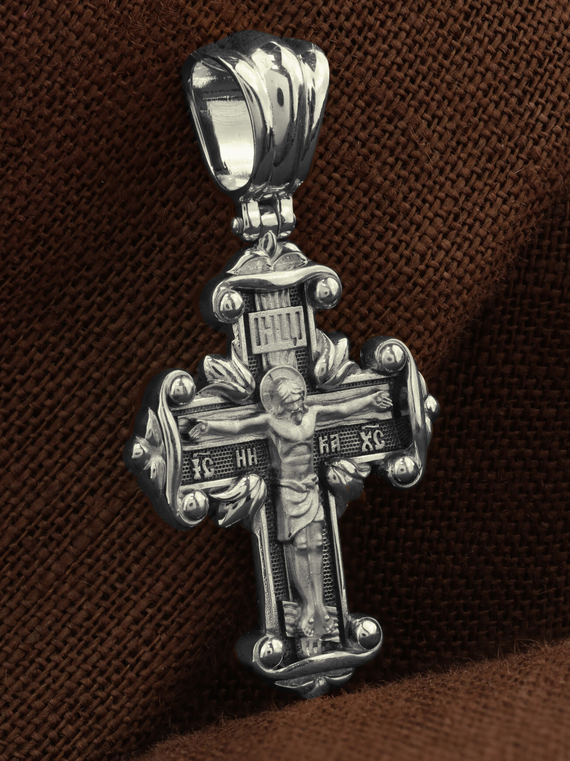 На лицевой стороне креста изображено Распятие Господа и Спасителя нашего Иисуса Христа, отдавшего Себя на смерть, для искупления грехов мира. Крест является символом жертвенной любви Всеблагого Бога к падшим людям, всепобеждающим духовным оружием христиан, основанием и средоточием церковной жизни. Господь сказал: кто хочет идти за Мною, отвергнись себя, и возьми крест свой, и следуй за Мною. (Мк. 8: 34). На верхней табличке, выше головы Иисуса, расположена надпись, составленная Понтием Пилатом — «IНЦI». Она означает «Иисус Назорей, Царь Иудейский». Надпись «IC» «ХC», означает Иисус Христос, помещается на разных сторонах поперечной перекладины креста. Рядом — слово «НИКА», что означает «победитель». На православном кресте Христос не умирает, а свободно простирает руки, ладони Иисуса открыты, будто он хочет обнять все человечество, даря им свою любовь и открывая путь к вечной жизни.